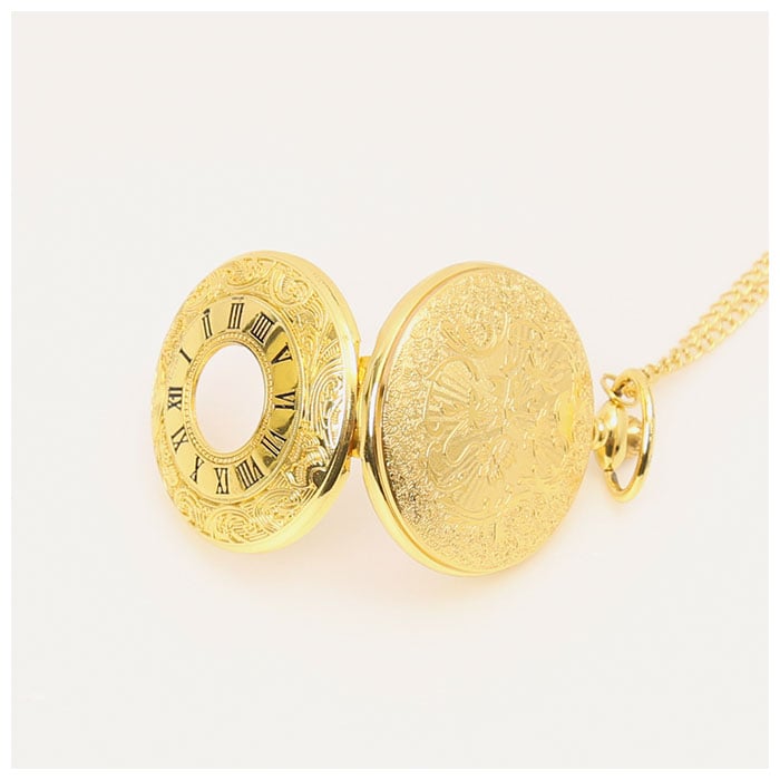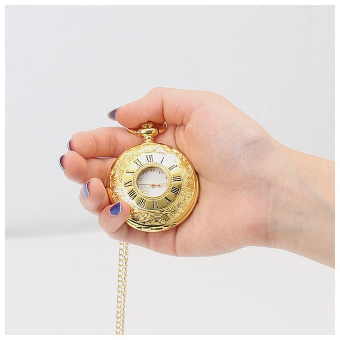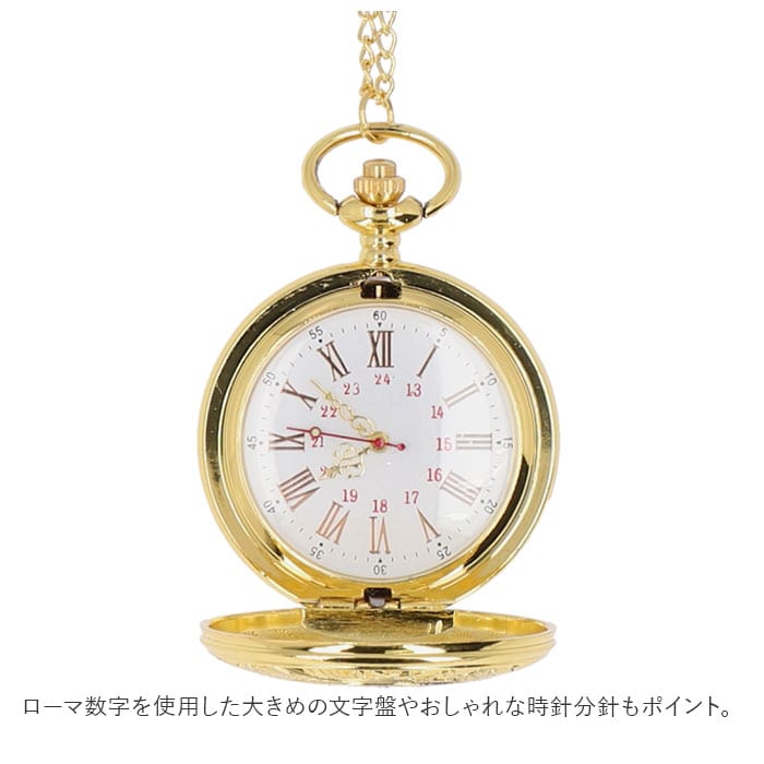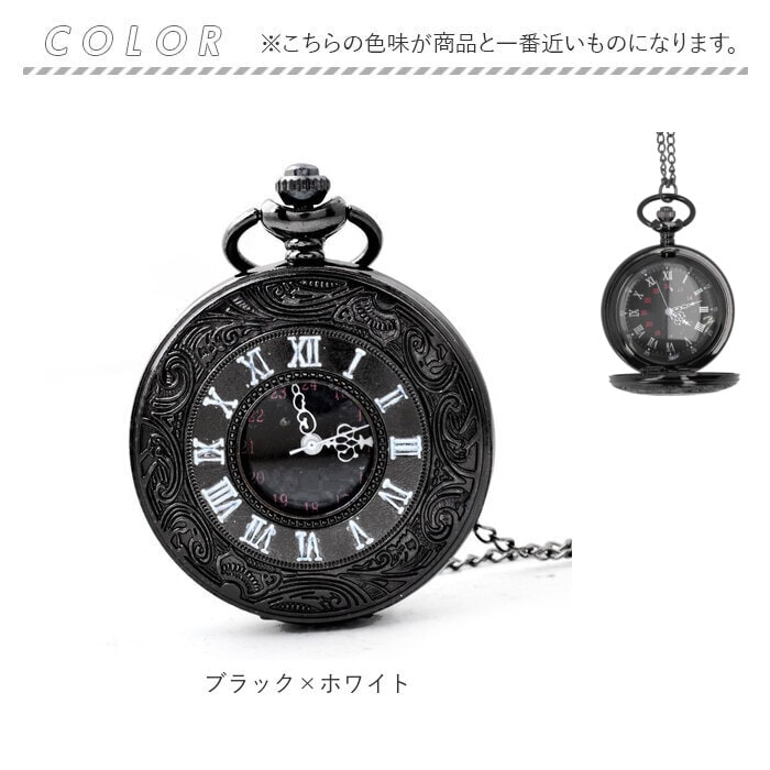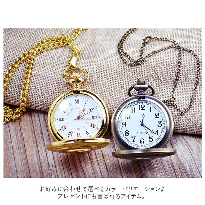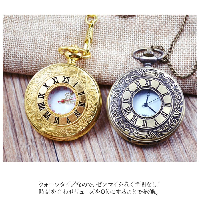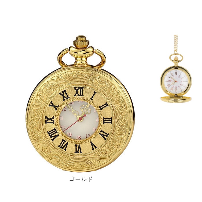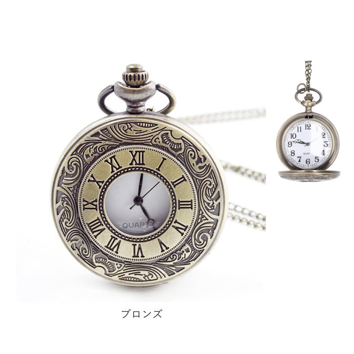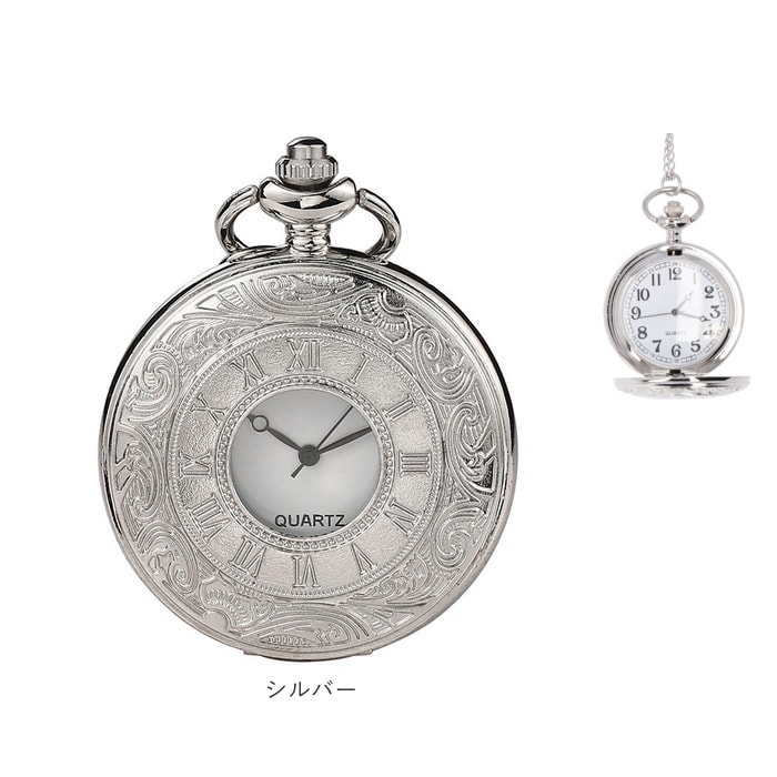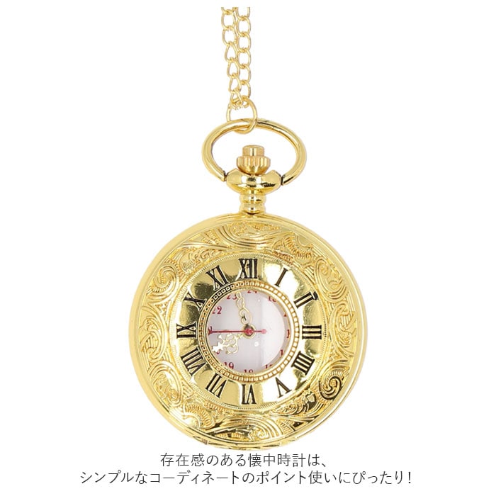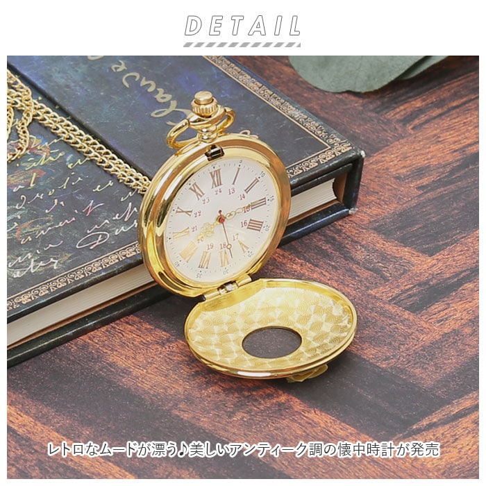 | 商品説明 | レトロなムードが漂う♪美しいアンティーク調の懐中時計が発売。トップのリューズを押し込むとフタが開く仕様。クォーツタイプなので、ゼンマイを巻く手間なし!時刻を合わせリューズをONにすることで稼働。ローマ数字を使用した大きめの文字盤やおしゃれな時針分針もポイント。ほどよい長さのチェーンストラップ付き。存在感のある懐中時計は、シンプルなコーディネートのポイント使いにぴったり!お好みに合わせて選べるカラーバリエーション♪プレゼントにも喜ばれるアイテム。 |