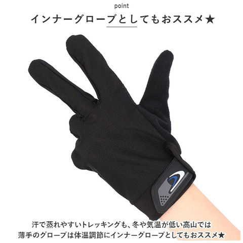 | 商品説明 | 登山やクライミング時の手の保護、防寒対策に!スタイリッシュなトレッキンググローブ。【スリーシーズン快適】グローブの生地は通気性のよい薄手のメッシュ生地を採用。親指部分は汗を吸収するタオル生地で仕上げ、スリーシーズン快適な付け心地。【しっかりとグリップ】手のひら全面に滑り止め加工が施してあるため、ロープやトレッキングステッキもしっかりとグリップ!【着用したまま操作可能】人差し指の先端部分にはスマホ対応加工済み。グローブを着用したままスマホやタブレットの操作が可能。【日差しからもガード】適度な保温性を保ちながら、怪我や日差しから手を優しくガードし、アウトドアアクティビティーがより安全に楽しめるお役立ちアイテム。【インナーグローブとしてもおススメ★】汗で蒸れやすいトレッキングも、冬や気温が低い高山では薄手のグローブは体温調節にインナーグローブとしてもおススメ★【ぴったりとフィット】手首には面ファスナー式ベルトが自分好みにぴったりとフィットして、グローブの脱げ落ちを防止。 |