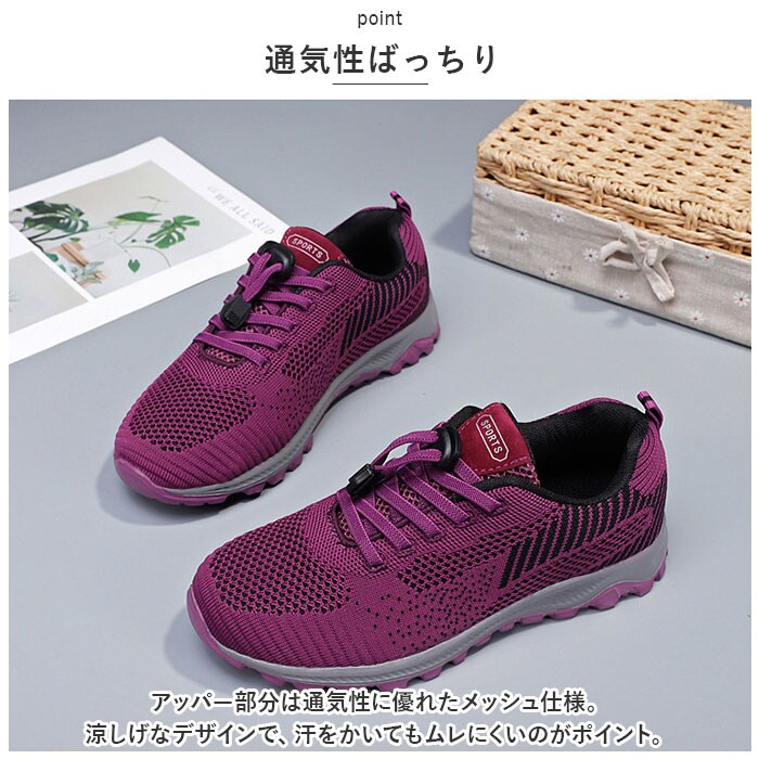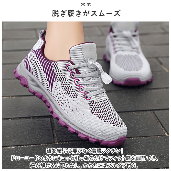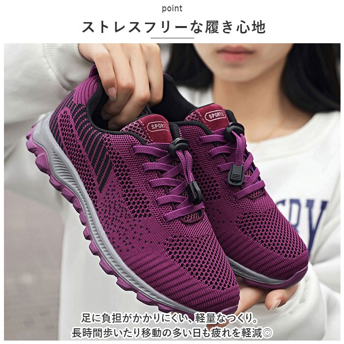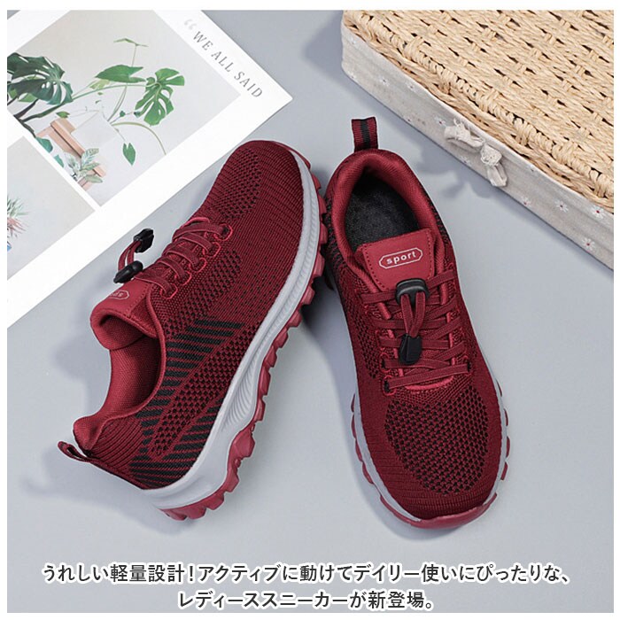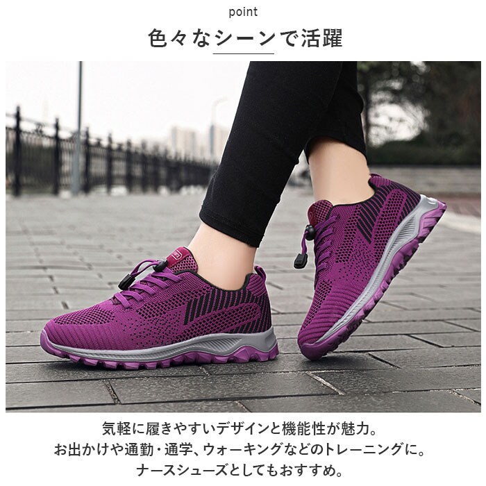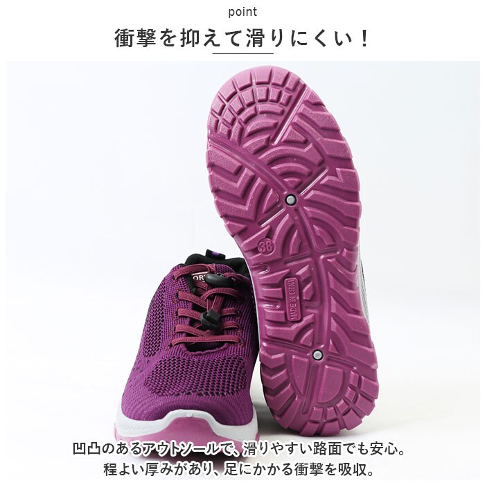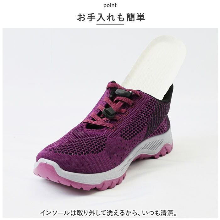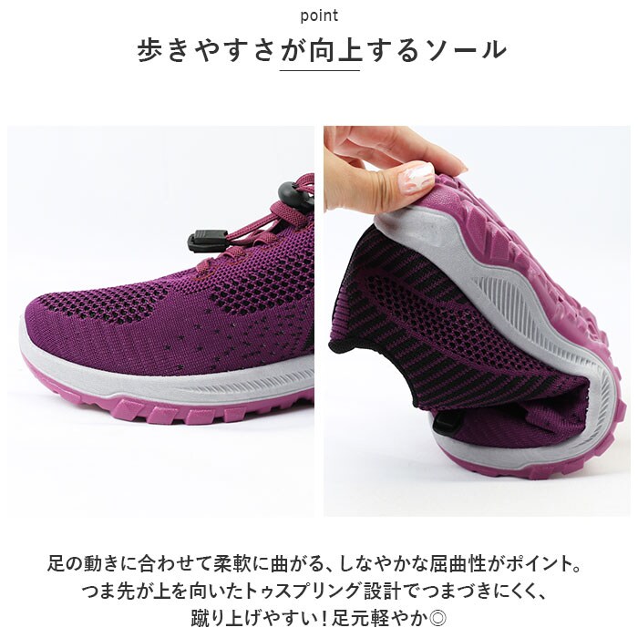 | 商品説明 | うれしい軽量設計!アクティブに動けてデイリー使いにぴったりな、レディーススニーカーが新登場。【ストレスフリーな履き心地】足に負担がかかりにくい、軽量なつくり。長時間歩いたり移動の多い日も疲れを軽減◎【通気性ばっちり】アッパー部分は通気性に優れたメッシュ仕様。涼しげなデザインで、汗をかいてもムレにくいのがポイント。【脱ぎ履きがスムーズ】紐を結ぶ必要がなく着脱ラクチン!ドローコードのようにキュッと引っ張るだけでフィット感を調節でき、紐が解ける心配もなし。かかとにはプルタブ付き。【歩きやすさが向上するソール】足の動きに合わせて柔軟に曲がる、しなやかな屈曲性がポイント。つま先が上を向いたトゥスプリング設計でつまづきにくく、蹴り上げやすい!足元軽やか◎【お手入れも簡単】インソールは取り外して洗えるから、いつも清潔。【衝撃を抑えて滑りにくい!】凹凸のあるアウトソールで、滑りやすい路面でも安心。程よい厚みがあり、足にかかる衝撃を吸収。【色々なシーンで活躍】気軽に履きやすいデザインと機能性が魅力。お出かけや通勤・通学、ウォーキングなどのトレーニングに。ナースシューズとしてもおすすめ。 |
