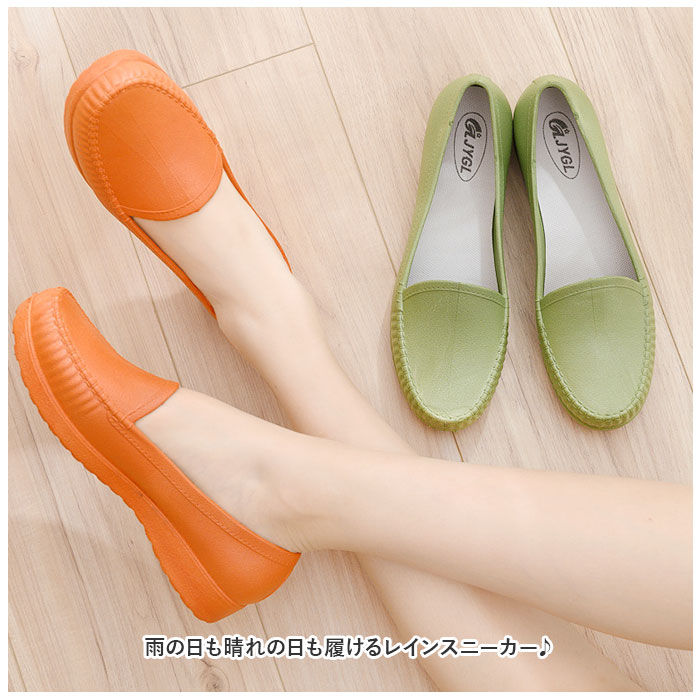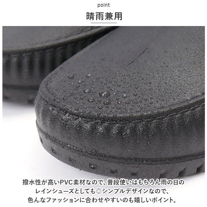 | 商品説明 | 雨の日も晴れの日も履けるレインスニーカー♪【お洒落は足元から】パッと見はどこから見てもシンプルなローファー。雨の日もオシャレにしたい貴方にピッタリ★雨が止んでそのまま履いてもレインシューズと気付かれない?!【PVC製】水に強いPVC(塩化ビニル樹脂)素材を使用し、アウトソールからアッパーまで、縫い目のない一体形成仕上げ。【晴雨兼用】撥水性が高いPVC素材なので、普段使いはもちろん雨の日のレインシューズとしても◎シンプルデザインなので、色んなファッションに合わせやすいのも嬉しいポイント。【屈曲性◎】柔らか素材で動きやすくストレスのない履き心地。足への負担が軽減。【衛生的】インソールは取り外して洗えるから、いつでも衛生的で安心。【滑りにくい】雨の日でも滑りにくい溝付きのアウトソール。 |