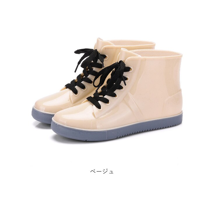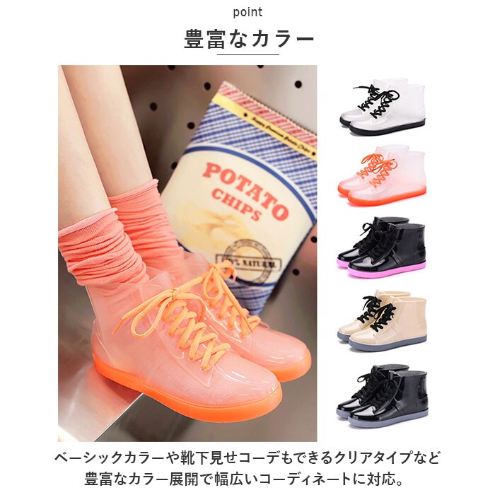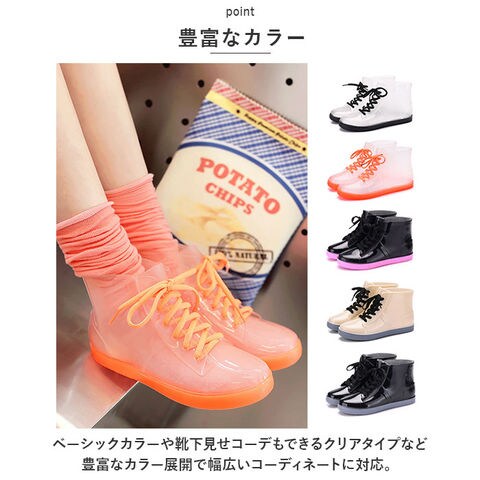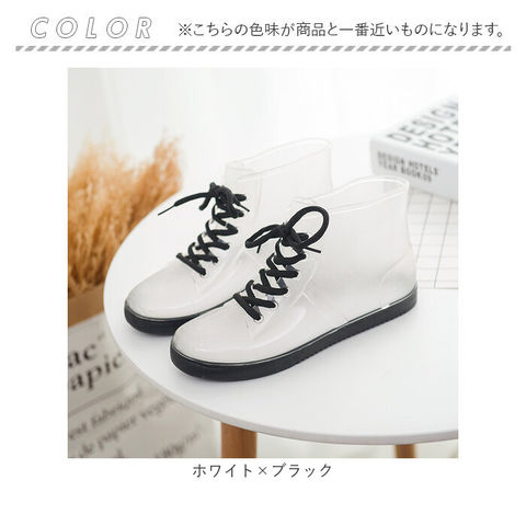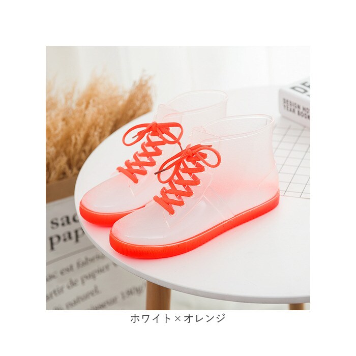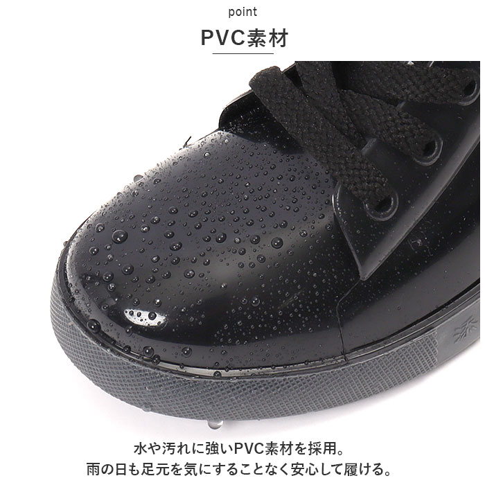 | 商品説明 | 雨の日も晴れの日も活躍するレインスニーカーが発売。【ハイカットタイプ】レインブーツに見えないスタイリッシュなハイカットタイプ。いつものスタイルを崩さず、雨の日もオシャレに。【PVC素材】水や汚れに強いPVC素材を採用。雨の日も足元を気にすることなく安心して履ける。【快適な履き心地】屈曲性に優れた柔らかな素材なので、履き心地も快適♪【滑りにくい】靴底には滑り止め加工を施しているので、濡れた場所でも滑りにくい。【豊富なカラー】ベーシックカラーや靴下見せコーデもできるクリアタイプなど豊富なカラー展開で幅広いコーディネートに対応。 |