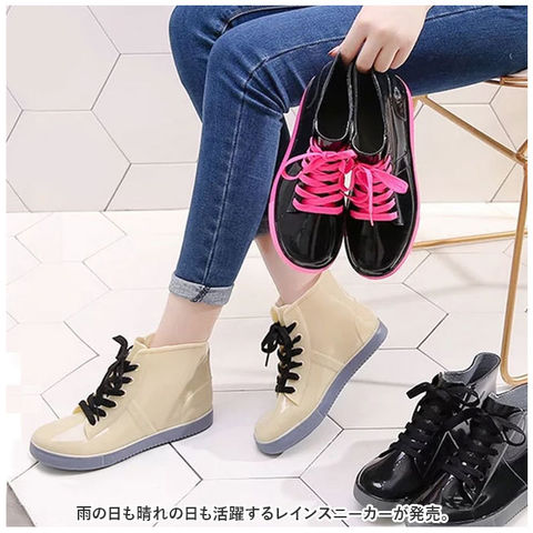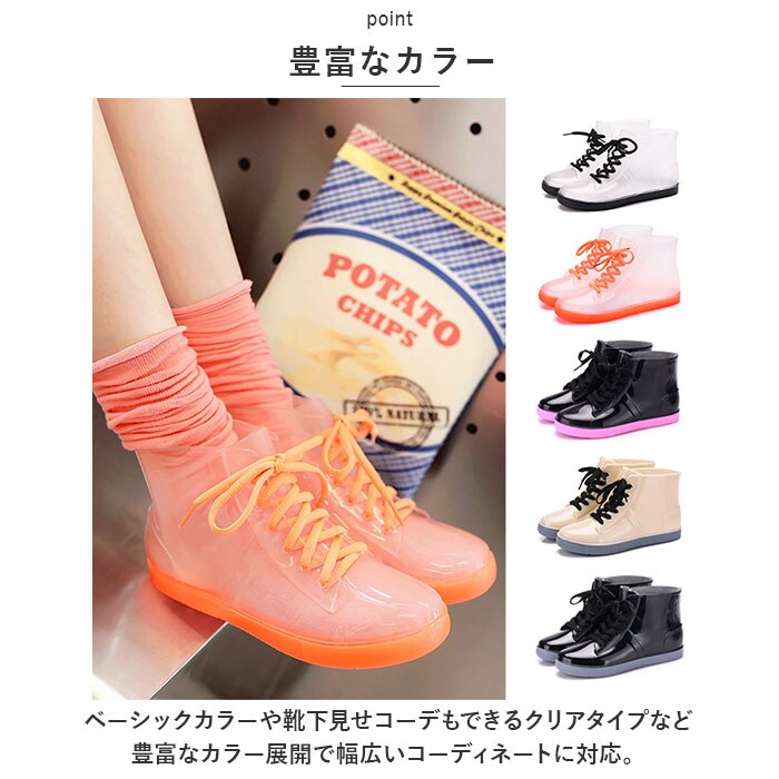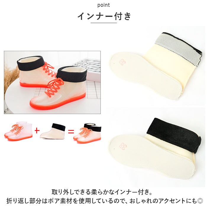 | 商品説明 | 雨の日も晴れの日も活躍するレインスニーカーが発売。【ハイカットタイプ】レインブーツに見えないスタイリッシュなハイカットタイプ。いつものスタイルを崩さず、雨の日もオシャレに。【PVC素材】水や汚れに強いPVC素材を採用。雨の日も足元を気にすることなく安心して履ける。【快適な履き心地】屈曲性に優れた柔らかな素材なので、履き心地も快適♪【滑りにくい】靴底には滑り止め加工を施しているので、濡れた場所でも滑りにくい。【インナー付き】取り外しできる柔らかなインナー付き。折り返し部分はボア素材を使用しているので、おしゃれのアクセントにも◎【豊富なカラー】ベーシックカラーや靴下見せコーデもできるクリアタイプなど豊富なカラー展開で幅広いコーディネートに対応。 |