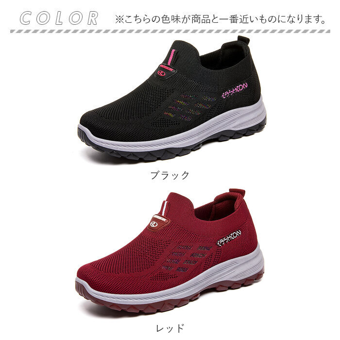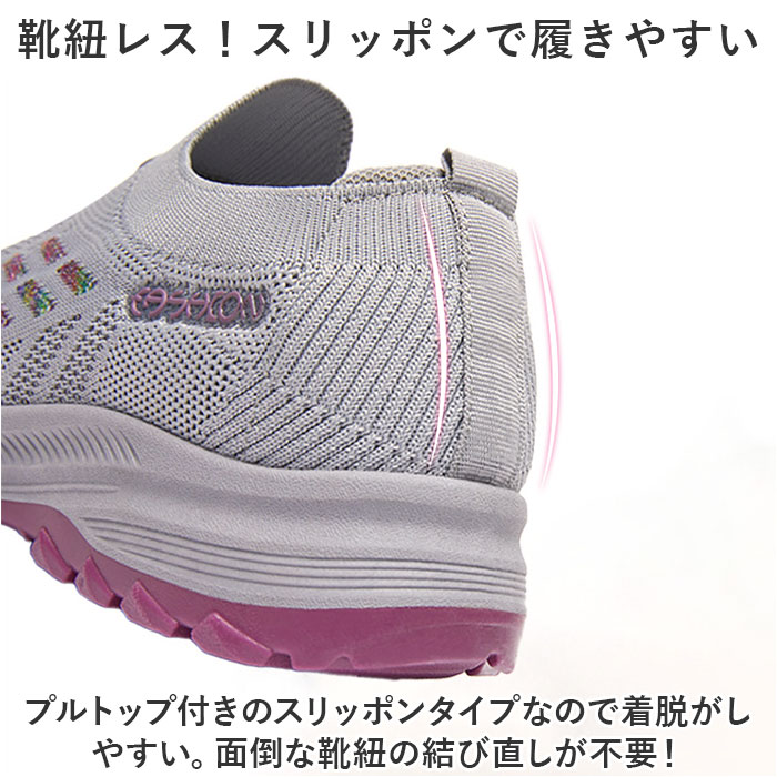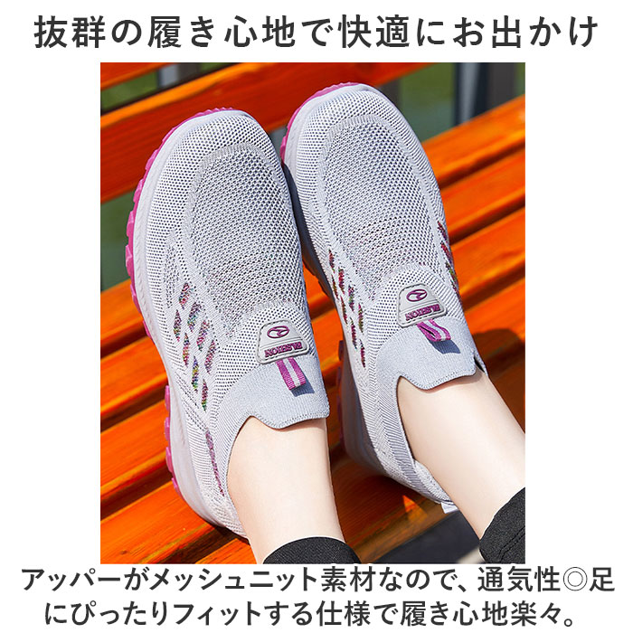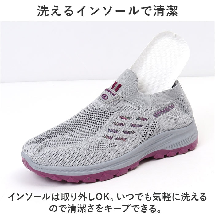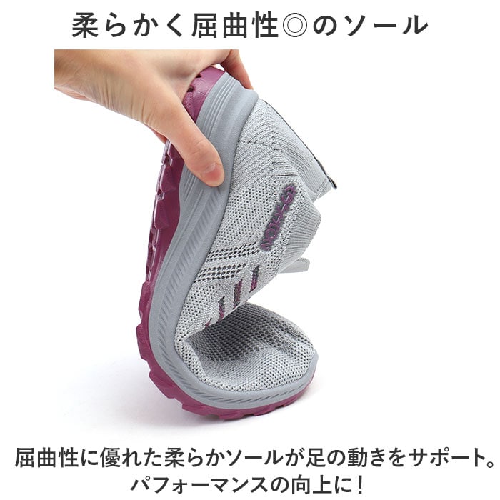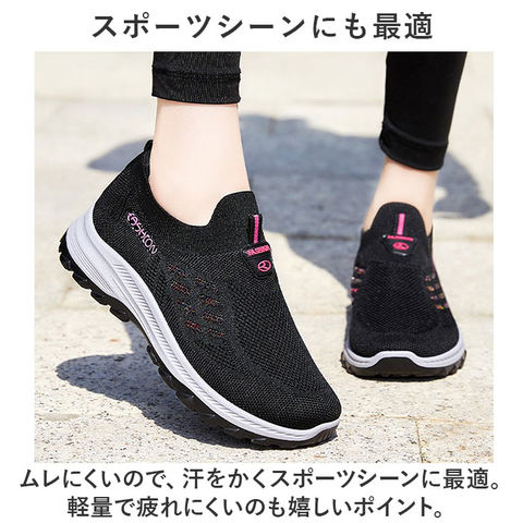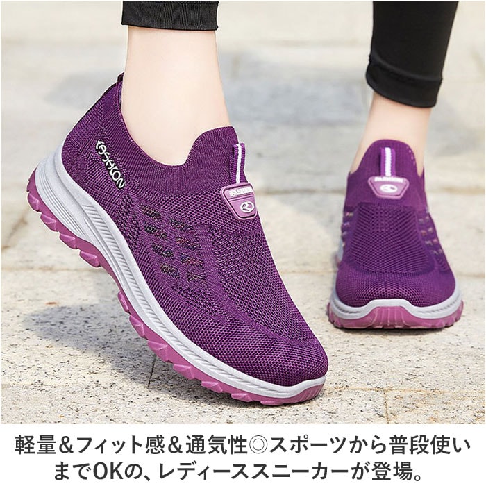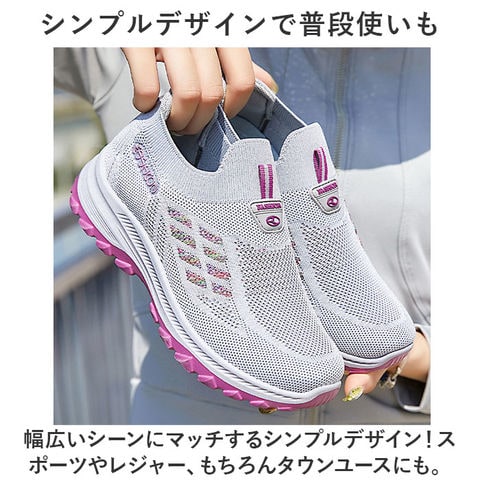 | 商品説明 | 軽量&フィット感&通気性◎スポーツから普段使いまでOKの、レディーススニーカーが登場。【抜群の履き心地で快適にお出かけ】アッパーがメッシュニット素材なので、通気性◎足にぴったりフィットする仕様で履き心地楽々。【スポーツシーンにも最適】ムレにくいので、汗をかくスポーツシーンに最適。軽量で疲れにくいのも嬉しいポイント。【柔らかく屈曲性◎のソール】屈曲性に優れた柔らかソールが足の動きをサポート。パフォーマンスの向上に!【靴紐レス!スリッポンで履きやすい】プルトップ付きのスリッポンタイプなので着脱がしやすい。面倒な靴紐の結び直しが不要!【滑りにくいので雨の日も安心】ソール部分は凸凹加工済み。雨の日の地面もしっかりグリップする、滑りにくい安心仕様。【シンプルデザインで普段使いも】幅広いシーンにマッチするシンプルデザイン!スポーツやレジャー、もちろんタウンユースにも。【洗えるインソールで清潔】インソールは取り外しOK。いつでも気軽に洗えるので清潔さをキープできる。 |