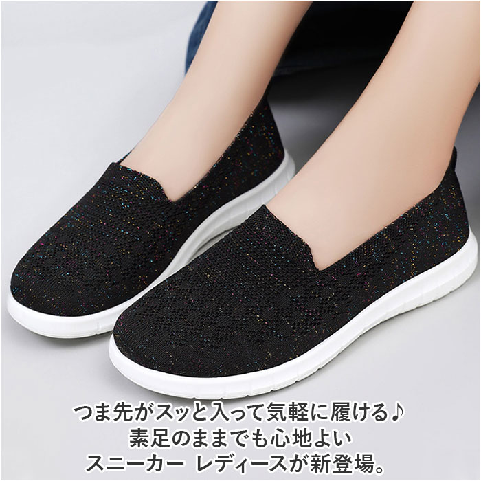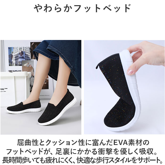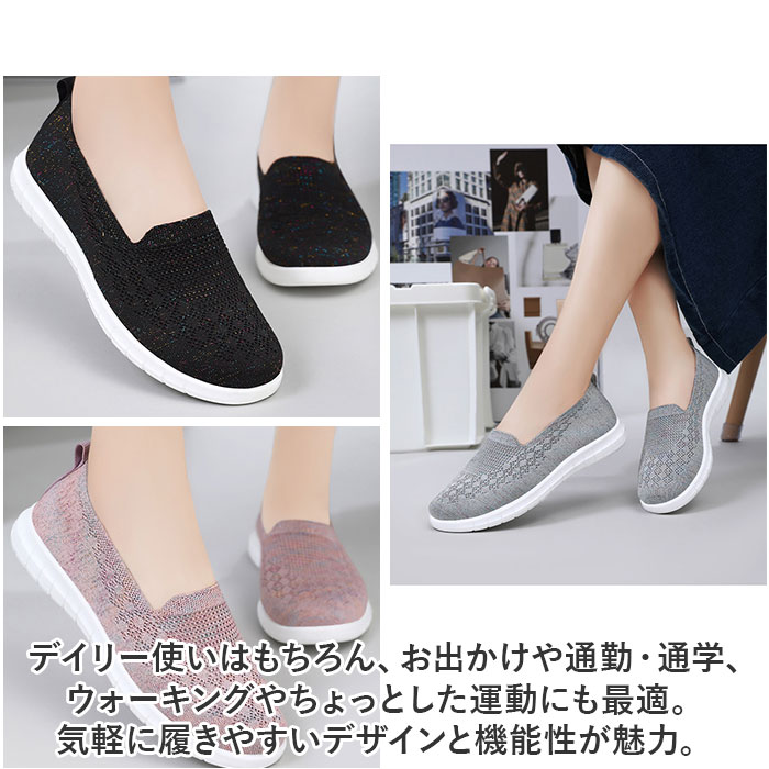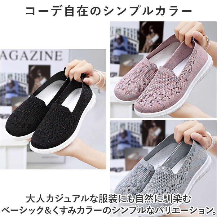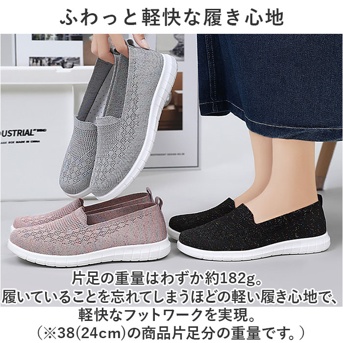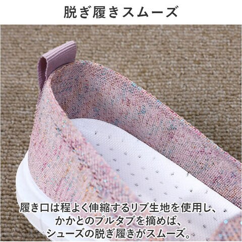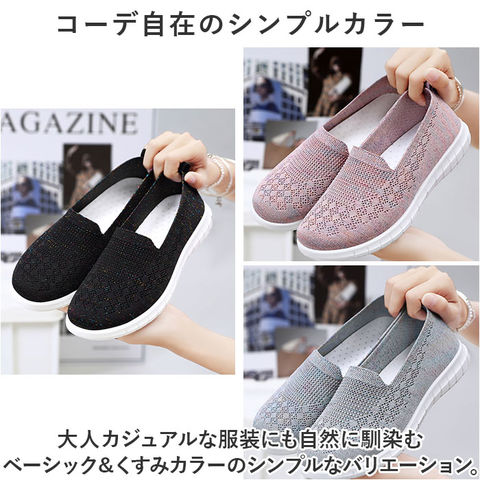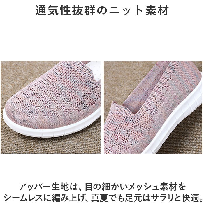 | 商品説明 | つま先がスッと入って気軽に履ける♪素足のままでも心地よいスニーカー レディースが新登場。【通気性抜群のニット素材】アッパー生地は、目の細かいメッシュ素材をシームレスに編み上げ、真夏でも足元はサラリと快適。【ふわっと軽快な履き心地】片足の重量はわずか約182g。履いていることを忘れてしまうほどの軽い履き心地で、軽快なフットワークを実現。(※38(24cm)の商品片足分の重量です。)【やわらかフットベッド】屈曲性とクッション性に富んだEVA素材のフットベッドが、足裏にかかる衝撃を優しく吸収。長時間歩いても疲れにくく、快適な歩行スタイルをサポート。【柔らか素材で足にフィット】クッション性のあるインソールが優しく足をサポート。いろんな足にフィットする、柔らかな素材を使用。【脱ぎ履きスムーズ】履き口は程よく伸縮するリブ生地を使用し、かかとのプルタブを摘めば、シューズの脱ぎ履きがスムーズ。【滑りにくいアウトソール】靴裏には滑りにくいよう加工を施し、歩きやすさに配慮。雨の日や雪の日の濡れた地面でもしっかりとグリップしてくれる安心の仕様。【コーデ自在のシンプルカラー】大人カジュアルな服装にも自然に馴染むベーシック&くすみカラーのシンプルなバリエーション。【色々なシーンで活躍】デイリー使いはもちろん、お出かけや通勤・通学、ウォーキングやちょっとした運動にも最適。気軽に履きやすいデザインと機能性が魅力。 |
