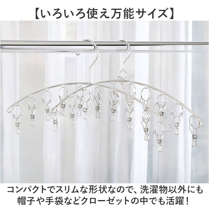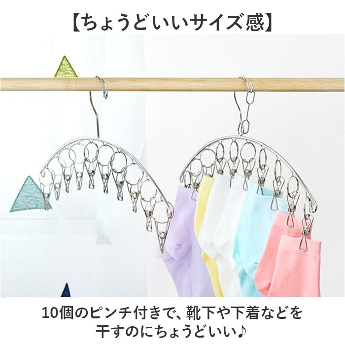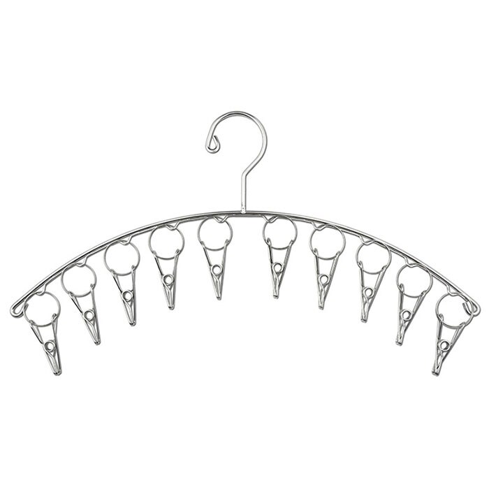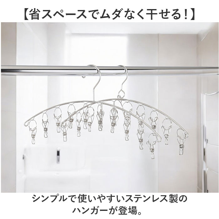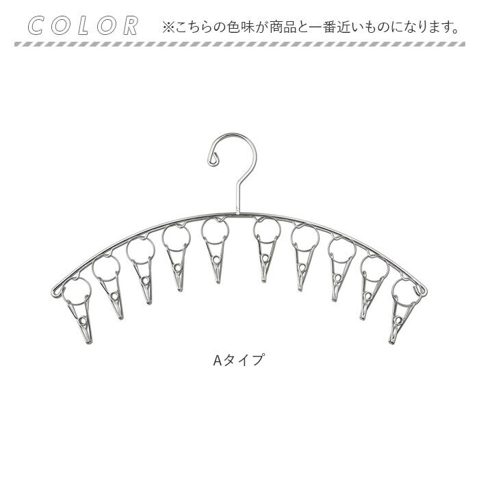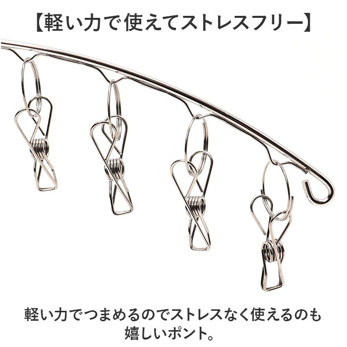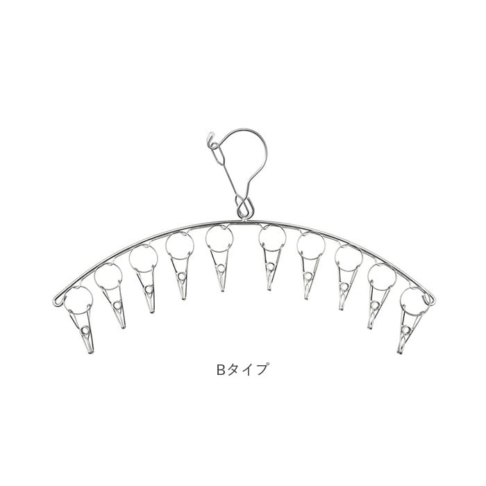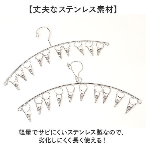 | 商品説明 | 【省スペースでムダなく干せる!】シンプルで使いやすいステンレス製のハンガーが登場。【ちょうどいいサイズ感】・10個のピンチ付きで、靴下や下着などを干すのにちょうどいい♪【丈夫なステンレス素材】軽量でサビにくいステンレス製なので、劣化しにくく長く使える!【軽い力で使えてストレスフリー】軽い力でつまめるのでストレスなく使えるのも嬉しいポント。【風の強い日も安心】洗濯物をしっかりと留めてくれる強力クリップで、風の強い日も安心。【選べるデザイン】・Aタイプはノーマルデザインなので室内用に。Bタイプは風飛び防止のフック付きで屋外用におすすめ。【いろいろ使える万能サイズ】コンパクトでスリムな形状なので、洗濯物以外にも帽子や手袋などクローゼットの中でも活躍! |