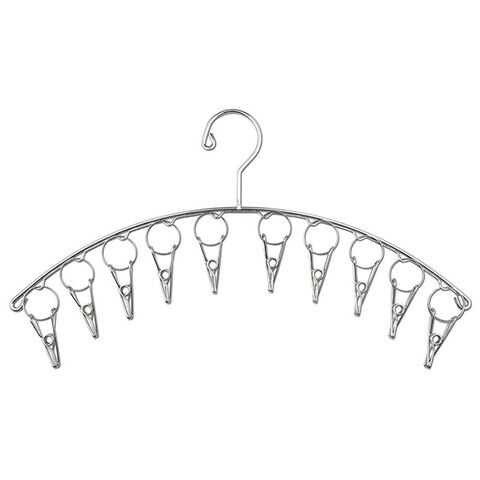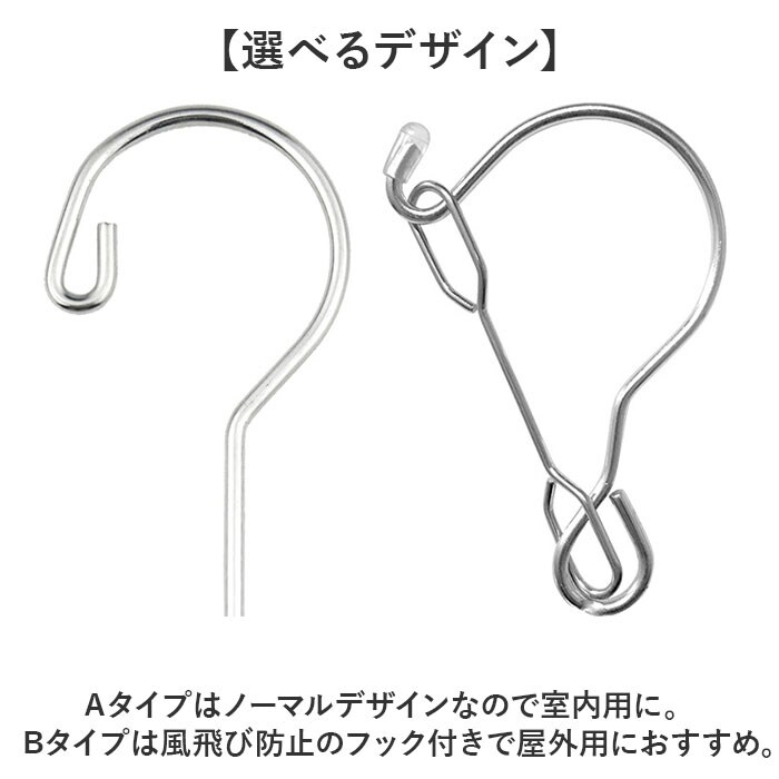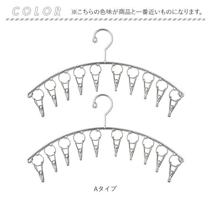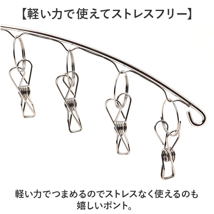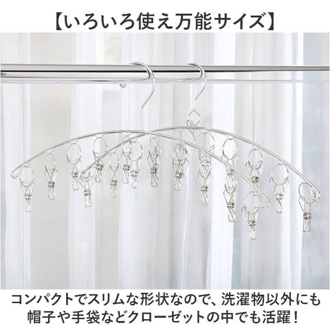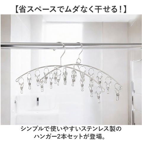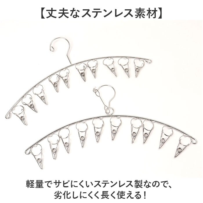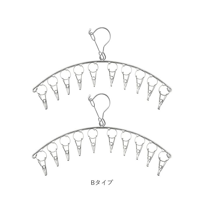 | 商品説明 | 【省スペースでムダなく干せる!】シンプルで使いやすいステンレス製のハンガー2本セットが登場。【ちょうどいいサイズ感】・10個のピンチ付きで、靴下や下着などを干すのにちょうどいい♪【丈夫なステンレス素材】軽量でサビにくいステンレス製なので、劣化しにくく長く使える!【軽い力で使えてストレスフリー】軽い力でつまめるのでストレスなく使えるのも嬉しいポント。【風の強い日も安心】洗濯物をしっかりと留めてくれる強力クリップで、風の強い日も安心。【選べるデザイン】・Aタイプはノーマルデザインなので室内用に。Bタイプは風飛び防止のフック付きで屋外用におすすめ。【いろいろ使える万能サイズ】コンパクトでスリムな形状なので、洗濯物以外にも帽子や手袋などクローゼットの中でも活躍! |