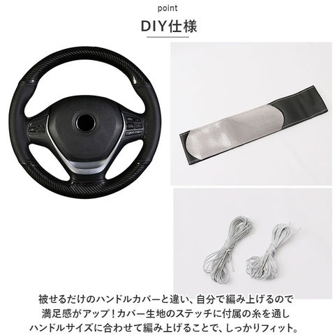 | 商品説明 | 愛車のハンドルカバーをカンタンに手作りできる♪手縫い仕様のハンドルカバー。【DIY仕様】被せるだけのハンドルカバーと違い、自分で編み上げるので、満足感がアップ!カバー生地のステッチに付属の糸を通し、ハンドルサイズに合わせて編み上げることで、しっかりフィット。【カーボン風デザイン】車のインテリアに溶け込むカーボン風デザイン。サイド部に握りやすく滑りにくいい素材を組み合わせグリップ力も◎お好みに合わせて選べる2タイプのデザイン展開。【ハンドル適用サイズ】直径約36.5cm~37.9cmのハンドルに対応、様々な車種で使える☆ |