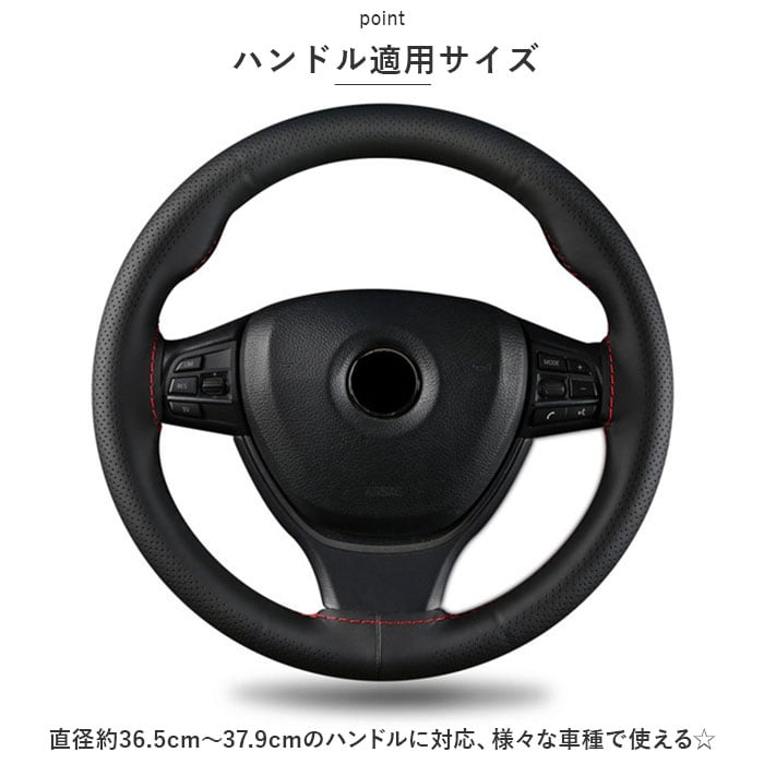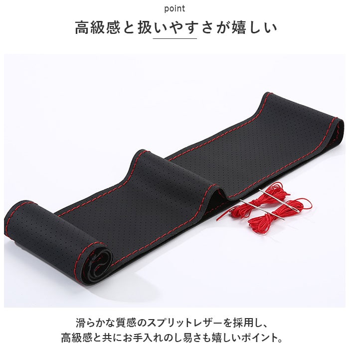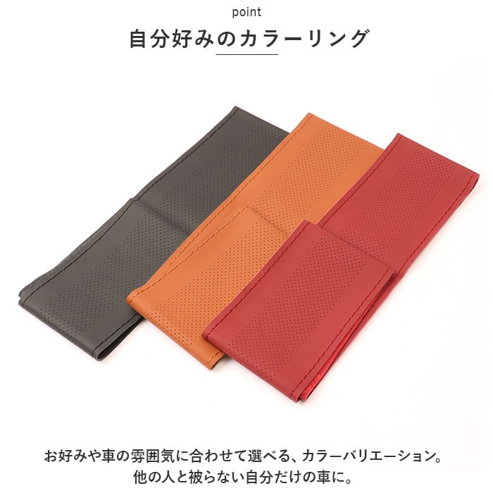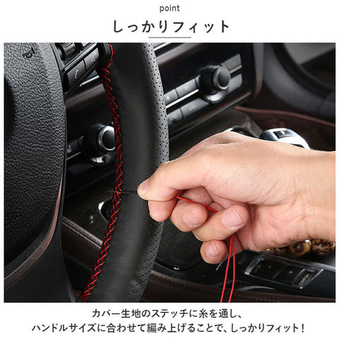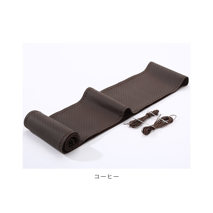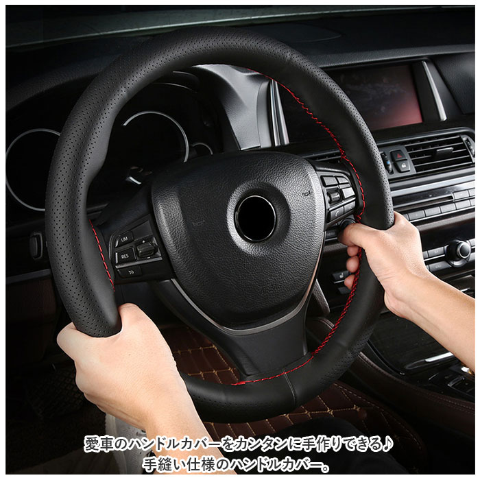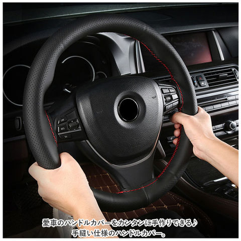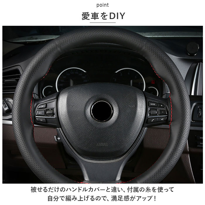 商品説明愛車のハンドルカバーをカンタンに手作りできる♪手縫い仕様のハンドルカバー。【自分好みのカラーリング】お好みや車の雰囲気に合わせて選べる、カラーバリエーション。他の人と被らない自分だけの車に。【愛車をDIY】被せるだけのハンドルカバーと違い、付属の糸を使って自分で編み上げるので、満足感がアップ!【高級感と扱いやすさが嬉しい】滑らかな質感のスプリットレザーを採用し、高級感と共にお手入れのし易さも嬉しいポイント。【滑りにくい】パンチング加工が施されており、滑りにくいのもポイント。【しっかりフィット】カバー生地のステッチに糸を通し、ハンドルサイズに合わせて編み上げることで、しっかりフィット!【ハンドル適用サイズ】直径約36.5cm~37.9cmのハンドルに対応、様々な車種で使える☆