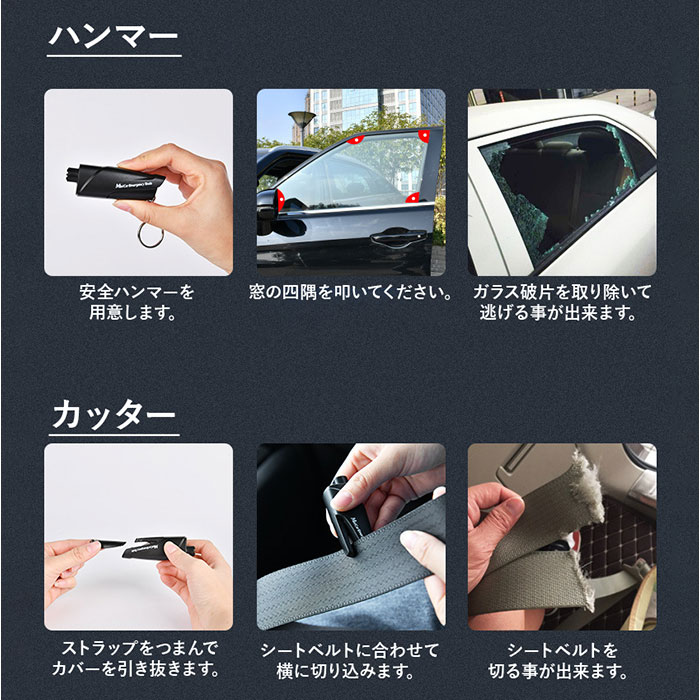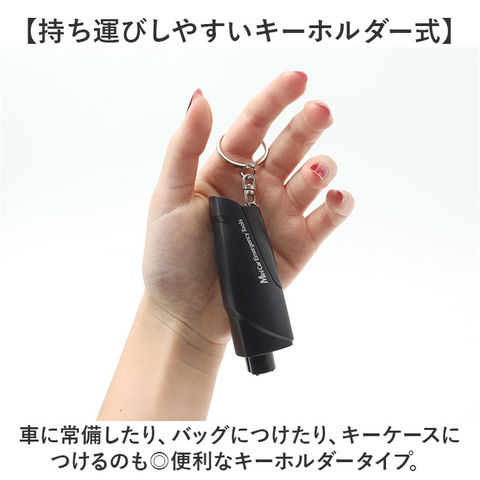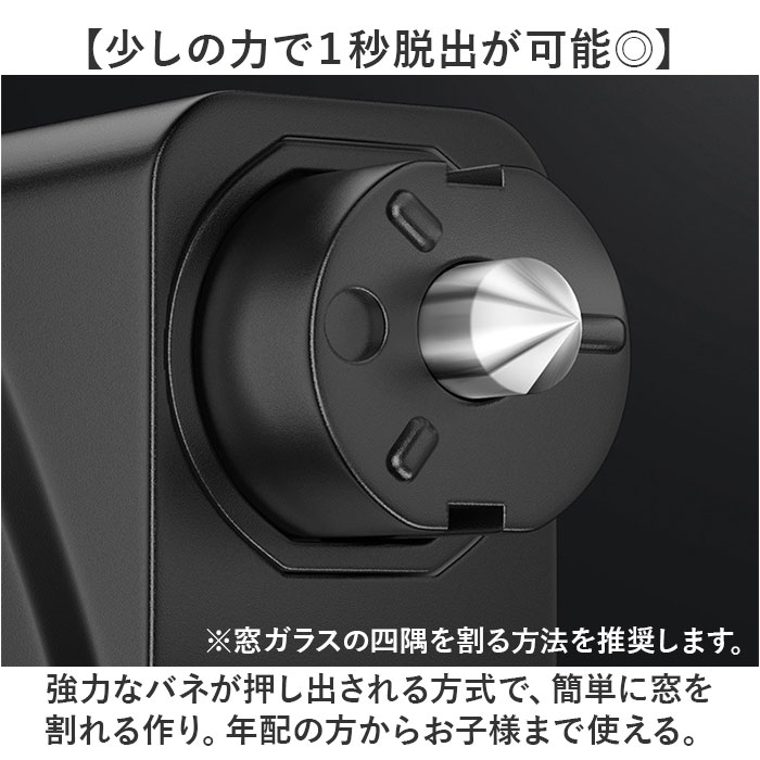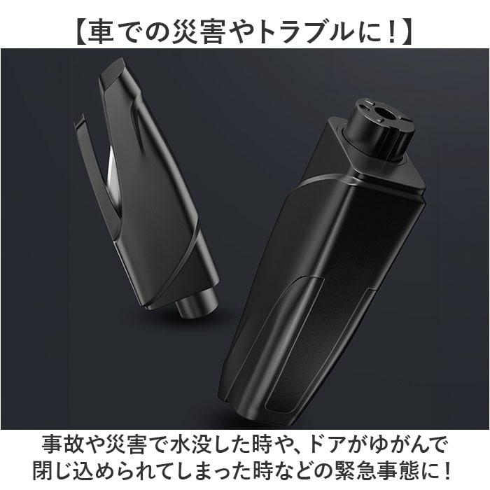| 商品説明 | 【いざという時のお助けアイテム!】シートベルトカッターと窓ガラス用ハンマーが1つになった「車用 脱出用ハンマー」が登場。【車での災害やトラブルに!】事故や災害で水没した時や、ドアがゆがんで閉じ込められてしまった時などの緊急事態に!【少しの力で1秒脱出が可能◎】強力なバネが押し出される方式で、簡単に窓を割れる作り。年配の方からお子様まで使える。※窓ガラスの四隅を割る方法を推奨します。【シートベルトをカッターを搭載】持ち手側のフタを外せば、カッターが登場。1つで2役こなしてくれる優れモノ!【持ち運びしやすいキーホルダー式】車に常備したり、バッグにつけたり、キーケースにつけるのも◎便利なキーホルダータイプ。【実際にお試しができるから安心!】テスト用のガラスがセットになっているので、実際に体験ができる!※ビニール袋と軍手を用意し、安全に考慮した環境でお試しください。 |
