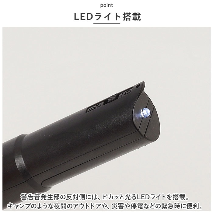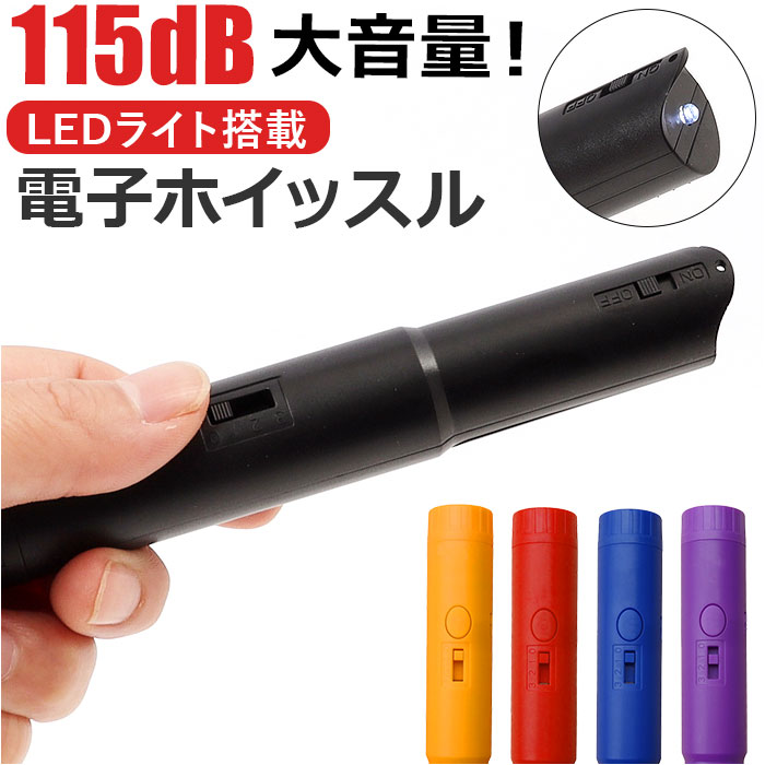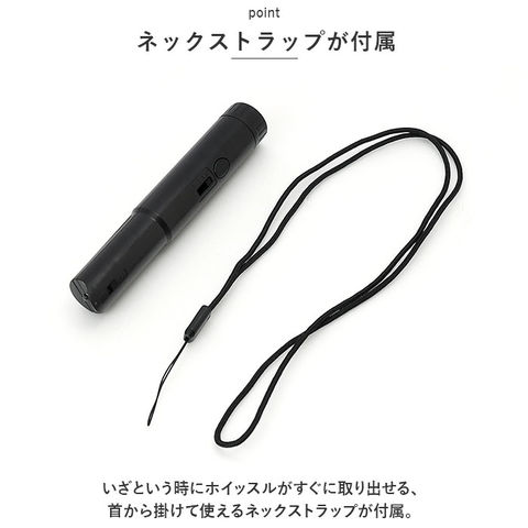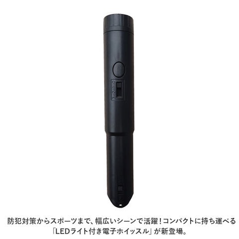 | 商品説明 | 防犯対策からスポーツまで、幅広いシーンで活躍!コンパクトに持ち運べる「LEDライト付き電子ホイッスル」が新登場。【小さいのにパワフル音量】ボタンをワンプッシュするだけで110dB~115dBの大音量で警告音が発信できる、スリム&コンパクトな電池式マルチホイッスル。【3段階音量調節】警告音発生ボタンすぐ下の切り替えスイッチで、ホイッスルの音量を3段階に調節可能。【口で吹かないから、衛生的】大きく息を吹きこんで音を鳴らす従来のホイッスルと違い、直接口で咥える必要がないので、ウィルス対策や衛生面でも安心。【LEDライト搭載】警告音発生部の反対側には、ピカッと光るLEDライトを搭載。キャンプのような夜間のアウトドアや、災害や停電などの緊急時に便利。【携帯性抜群のスティック形状】マーカーペンのように軽くてスリムなスティック形状で、ジャケットのポケットやカバンの片隅に入れてコンパクトに持ち運びが可能。【電池交換は誰でも簡単!】LR44ボタン型電池4個使用。ホイッスル背面のカバーを取り外せば、電池交換がスムーズ。(※お試し用ボタン電池が付属しています。)【様々なシーンで大活躍】運動会やスポーツ大会での使用はもちろん、登山やアウトドアで緊急時の注意喚起用にも最適。スポーツ競技で審判やラインズマンを務められるプロの方にもオススメ。【ネックストラップが付属】いざという時にホイッスルがすぐに取り出せる、首から掛けて使えるネックストラップが付属。 |