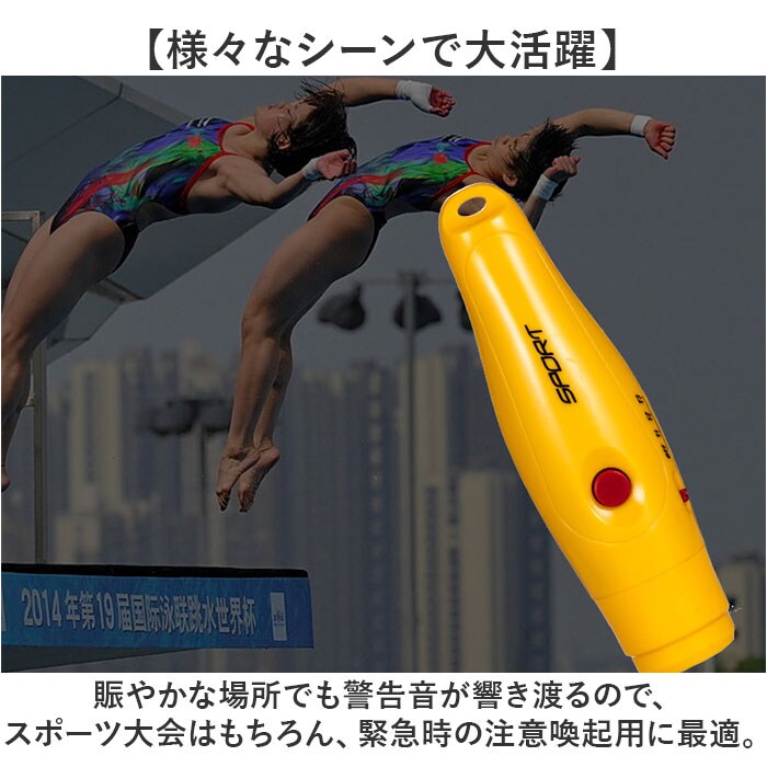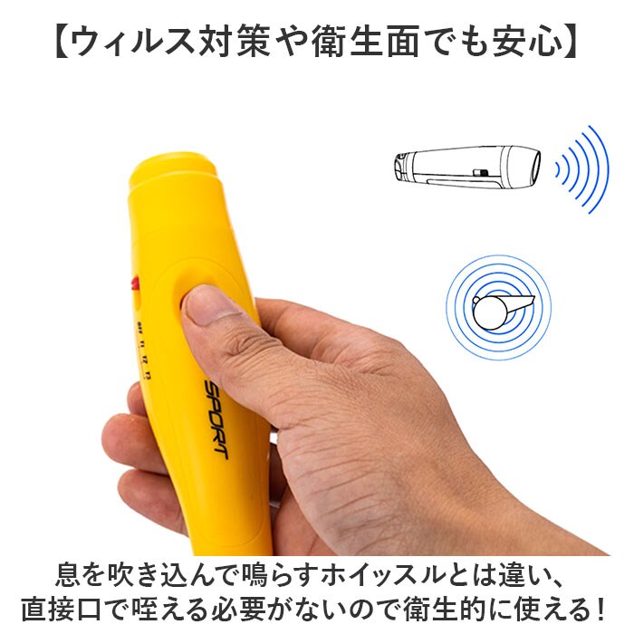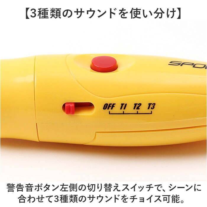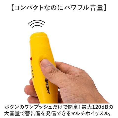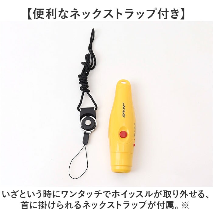 | 商品説明 | 【口で吹かないから、衛生的!】防犯対策からスポーツまで、幅広いシーンで活躍!マルチに使える「電子ホイッスル」が新登場。【コンパクトなのにパワフル音量】ボタンのワンプッシュだけで簡単!最大120dBの大音量で警告音を発信できるマルチホイッスル。【3種類のサウンドを使い分け】警告音ボタン左側の切り替えスイッチで、シーンに合わせて3種類のサウンドをチョイス可能。【ウィルス対策や衛生面でも安心】息を吹き込んで鳴らすホイッスルとは違い、直接口で咥える必要がないので衛生的に使える!【握りやすいスティック形状】手のひらにすっぽり包めるほどのスマートな流線形状で、ポケットに入れて持ち運びも楽ちん。【学校の先生や、スポーツのプロに】学校の先生やスポーツ教室のコーチ、スポーツ競技で審判を務められるプロの方にもオススメ。【様々なシーンで大活躍】賑やかな場所でも警告音が響き渡るので、スポーツ大会はもちろん、緊急時の注意喚起用に最適。【電池交換は誰でも簡単!】CR2032ボタン型電池×4個使用。ホイッスル背面のカバーを取り外せば、電池交換がスムーズ。※お試し用ボタン型電池が付属しています。【便利なネックストラップ付き】いざという時にワンタッチでホイッスルが取り外せる、首に掛けられるネックストラップが付属。※ストラップ根元のリング中央のボタンを押して、リングごと持ち上げると簡単に取り外しが可能。 |