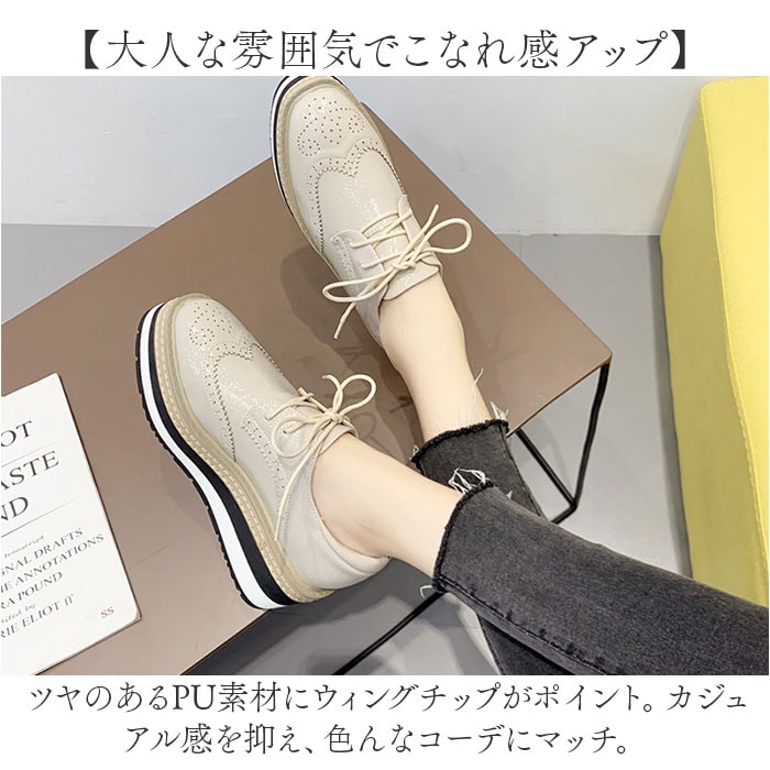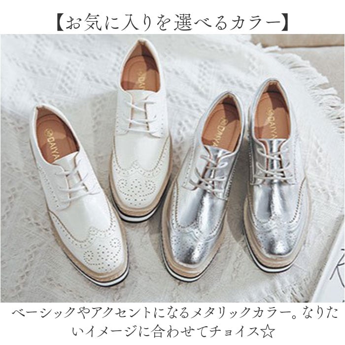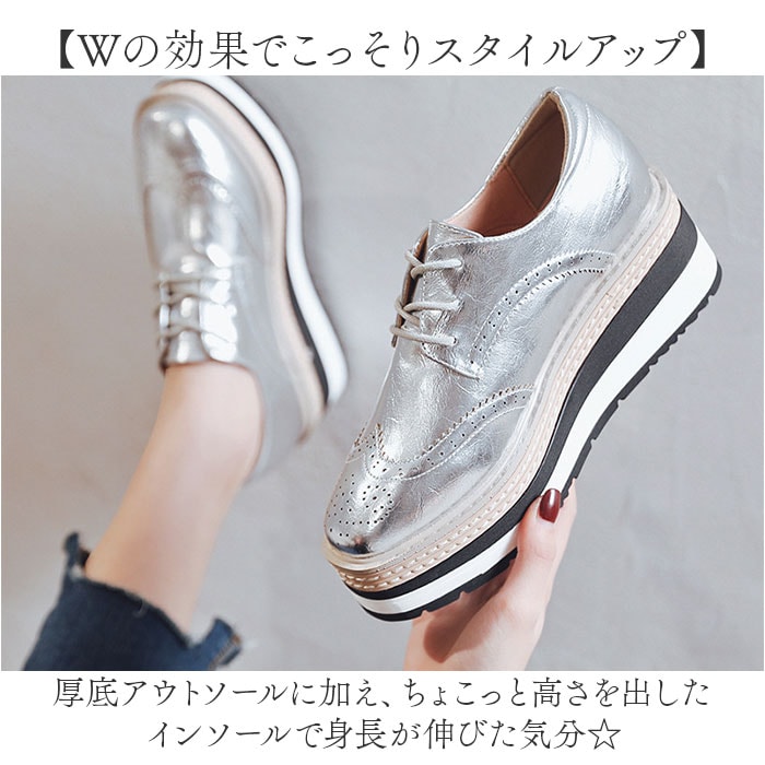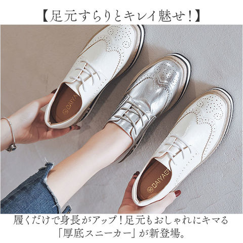 | 商品説明 | 【足元すらりとキレイ魅せ!】履くだけで身長がアップ!足元もおしゃれにキマる「厚底スニーカー」が新登場。【Wの効果でこっそりスタイルアップ】厚底アウトソールに加え、ちょこっと高さを出したインソールで身長が伸びた気分☆【フィット感を高めるシューレース】紐の結び具合で多少のサイズ調節が可能。シューズと足が一体化するような着用感。【安定感のあるフラット設計】しっかりとした厚みで、足裏にかかる衝撃を吸収。前後差を抑えた形状なので、疲れも軽減◎【大人な雰囲気でこなれ感アップ】ツヤのあるPU素材にウィングチップがポイント。カジュアル感を抑え、色んなコーデにマッチ。【お気に入りを選べるカラー】ベーシックやアクセントになるメタリックカラー。なりたいイメージに合わせてチョイス☆ |
