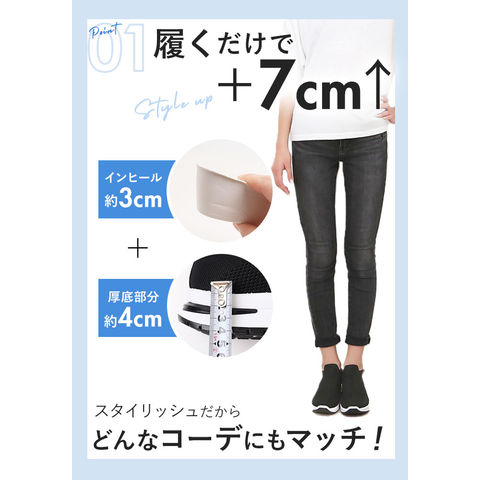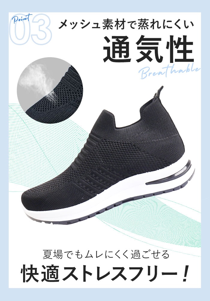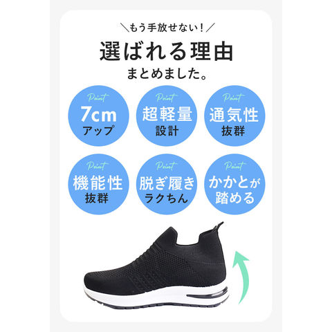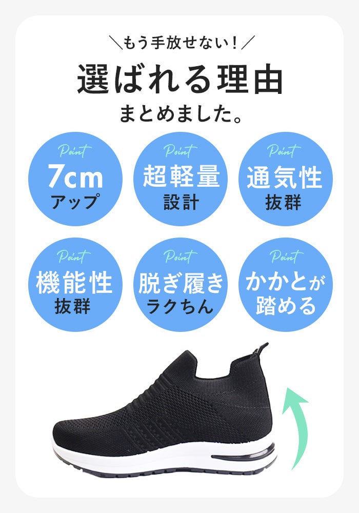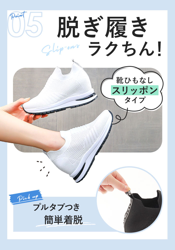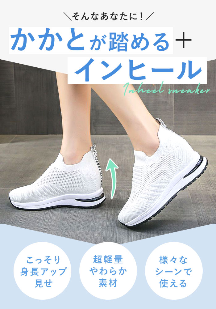 | 商品説明 | 【足元すらりキレイ魅せ】履くだけで身長がアップする!「インヒールスニーカー」が新登場。【Wの効果でこっそりスタイルアップ】約4cmのアウトソールと約3cmの取り外し可能なインソールで、身長が伸びた気分☆【フィット感抜群のニット仕上げ】アッパー部分は、ストレッチ性のあるメッシュニット生地。優しく包み込んでくれるのが嬉しい!【汗ばむ季節もサラッと快適】通気性に優れており、熱がこもりにくい!夏場でもムレにくいのがポイント。【どこでも脱ぎ履きスムーズ】足入れスムーズなスリッポンタイプ。かかとにはプルタブ付きで、脱ぎ履きに手間取らない♪【屈曲性があり、歩きやすさが向上】つま先部分は、足の動きに合わせて柔軟に曲がる上向き形状。蹴り上げやすくつまずきにくい!【滑りにくく安定感のあるソール】底面に凹凸を施した滑りにくい仕様。安定した歩行をサポート。【トレンド感のある足元を演出】シンプルながら抜け感のあるデザイン。コーデに合わせやすいベーシックカラーをラインナップ。 |