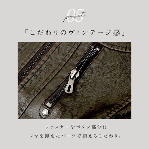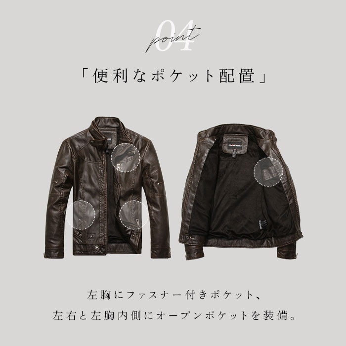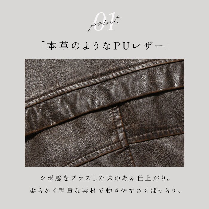 | 商品説明 | 大人の魅力あふれる1着。タウンユースにもバイクジャケットとしても、おしゃれにキマる!メンズ用ライダースジャケットが登場。【本革にも劣らないデザイン性】柔らかなPUレザー素材を使い、シボ感をプラスした風合いのある仕上がり。ボディラインに心地よく馴染んで、動きやすさもばっちり。本革のような面倒なお手入れは不要!【すっきりとしたシングルタイプ】フロントジップに、襟元はスナップボタンベルト付きのスタンドカラー。ハードすぎず、スマートな印象を演出。【防寒対策にも】身頃部分は薄手の裏起毛仕様。季節の変わり目など、肌寒い季節のツーリングなどにもおすすめ。【便利なポケット付き】左胸にファスナーポケット、左右と内側の左胸にオープン仕様のポケットを装備。ファスナーポケットは中身が飛び出す心配がなく安心。【こだわりのディテール】ツヤを抑えたジップや、各所に配置された金具のモチーフがアクセント。スタイリッシュかつヴィンテージ感漂うアイテム。 |