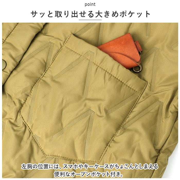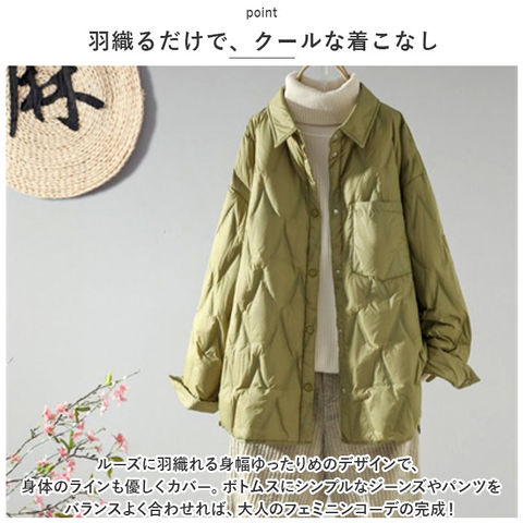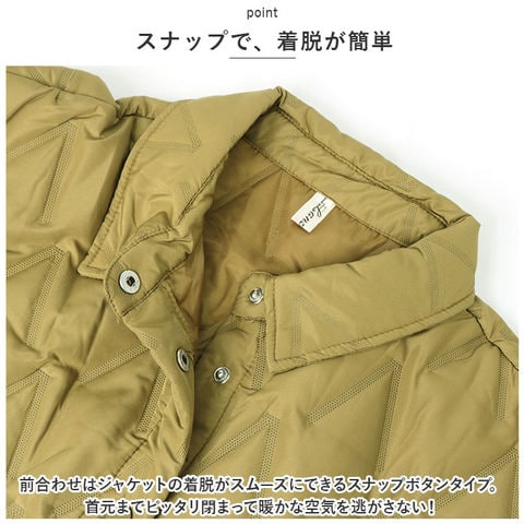 | 商品説明 | ふんわり軽いのに、ジャケットの中はほっこり暖か♪キレイめレイヤードスタイルの必須アイテム「キルティングジャケット」が新登場!【ファッションに温かみをプラス】サッと羽織るだけで上品な季節感をプラス!逆V字パターンの圧着ステッチがアクセントになった、ショート丈のキルティングジャケット。【暖かくて、驚くほど軽い】身頃部分と袖裏にもたっぷりと中綿キルト生地を使用。着ぶくれして見えない程よい厚みに中綿を充填し、保温性を保ちながらもスッキリとしたシルエットと驚きの軽さを実現。【縫い目を造らず、丈夫な圧着加工】通常のキルティング加工とは異なり、縫い目を造らず中綿が吹き出しにくい「ノーステッチ圧着加工」を施した丈夫な仕上がり。【スナップで、着脱が簡単】前合わせはジャケットの着脱がスムーズにできるスナップボタンタイプ。首元までピッタリ閉まって暖かな空気を逃がさない!【手首にピタッとフィット】袖口部分にもパチンッと閉まるスナップボタン付きなので、袖の膨らみで手元の動きが邪魔されず、すき間風もしっかりシャットアウト。【サッと取り出せる大きめポケット】左胸の位置には、スマホやキーケースがちょこんとしまえる便利なオープンポケット付き。【羽織るだけで、クールな着こなし】ルーズに羽織れる身幅ゆったりめのデザインで、身体のラインも優しくカバー。ボトムスにシンプルなジーンズやパンツをバランスよく合わせれば、大人のフェミニンコーデの完成! |