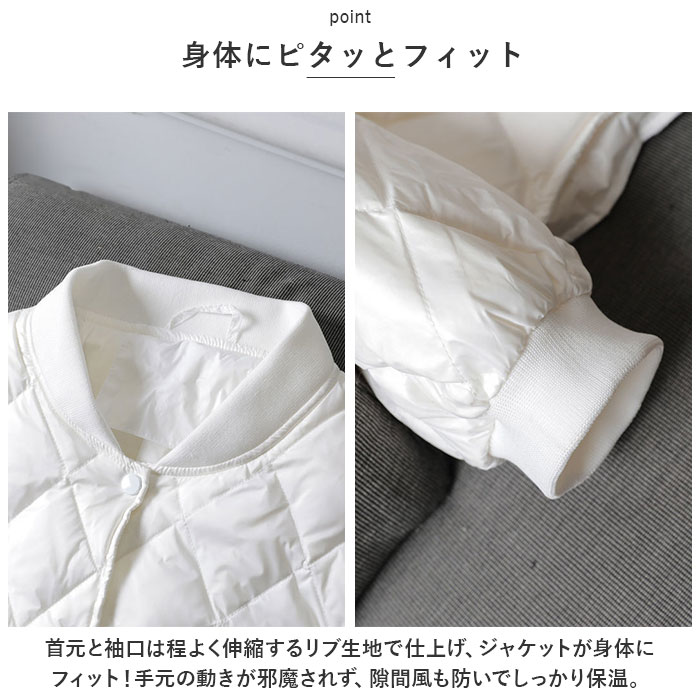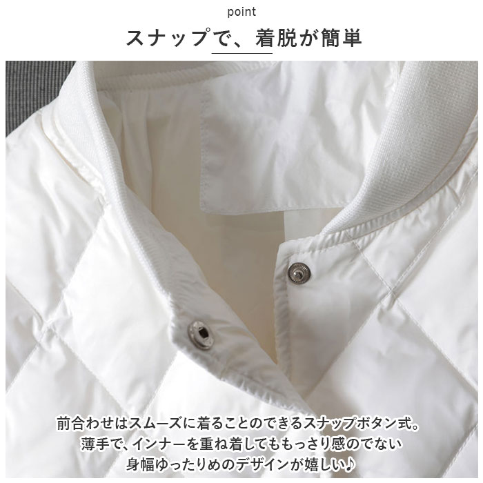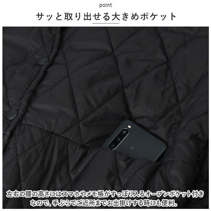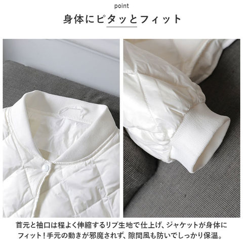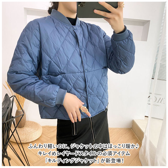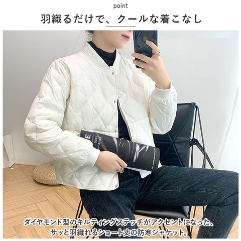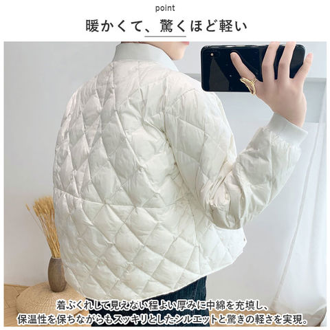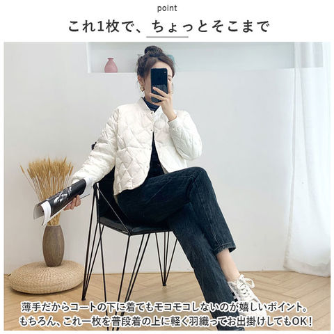 | 商品説明 | ふんわり軽いのに、ジャケットの中はほっこり暖か♪キレイめレイヤードスタイルの必須アイテム「キルティングジャケット」が新登場!【羽織るだけで、クールな着こなし】ダイヤモンド型のキルティングステッチがアクセントになった、サッと羽織れるショート丈の防寒ジャケット。【暖かくて、驚くほど軽い】着ぶくれして見えない程よい厚みに中綿を充填し、保温性を保ちながらもスッキリとしたシルエットと驚きの軽さを実現。【スナップで、着脱が簡単】前合わせはスムーズに着ることのできるスナップボタン式。薄手で、インナーを重ね着してももっさり感のでない身幅ゆったりめのデザインが嬉しい♪【身体にピタッとフィット】首元と袖口は程よく伸縮するリブ生地で仕上げ、ジャケットが身体にフィット!手元の動きが邪魔されず、隙間風も防いでしっかり保温。【サッと取り出せる大きめポケット】左右の腰の高さにはスマホやメモ帳がすっぽり入るオープンポケット付きなので、手ぶらでご近所までお出掛けする時にも便利。【これ1枚で、ちょっとそこまで】薄手だからコートの下に着てもモコモコしないのが嬉しいポイント。もちろん、これ一枚を普段着の上に軽く羽織ってお出掛けしてもOK!【ファッションに温かみをプラス】無地の落ち着いたカラーにダイヤモンドステッチを効かせたシンプルデザイン。襟ぐりが丸く開いたラウンドネックタイプなので、タートルネックのニットやシャツの襟をチラッと覗かせて、レイヤードスタイルも自在。 |