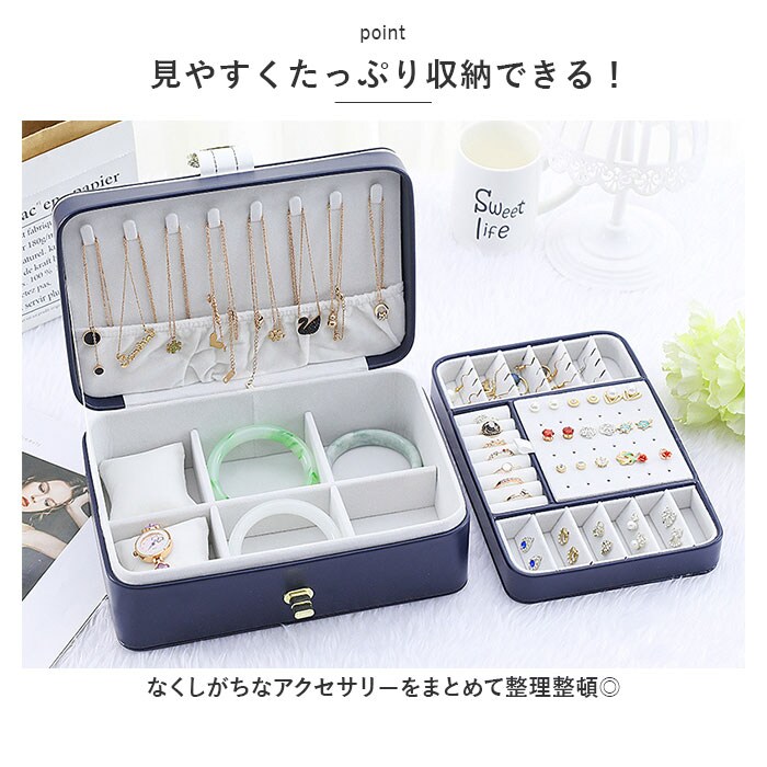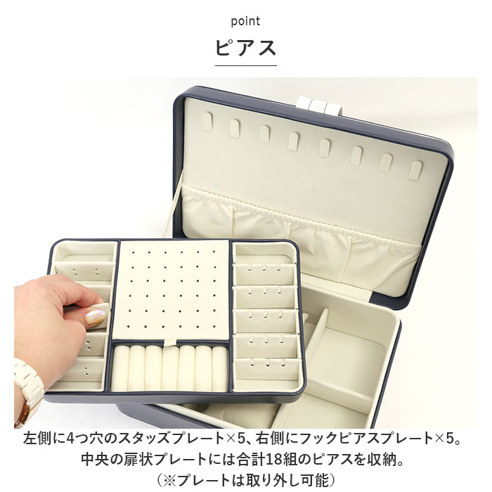 | 商品説明 | お気に入りのアクセサリーがスッキリ収納できる!大容量ジュエリーボックス。【捻り金具開口】カンタン開閉!しっかりロックできて、中身がこぼれ落ちる心配なし◎【上品なデザイン】シンプルなフェイクレザー素材のボックス。キラッと輝く金具がアクセント♪【傷付きを防止】ベロアのような素材の内張り仕様。【見やすくたっぷり収納できる!】なくしがちなアクセサリーをまとめて整理整頓◎【フタ裏】ネックレスが8本掛けられる!チェーンが絡まず収納できるギャザーポケット付き。《上段》【ピアス】左側に4つ穴のスタッズプレート×5、右側にフックピアスプレート×5。中央の扉状プレートには合計18組のピアスを収納。(※プレートは取り外し可能)【ミニブローチやイヤリング】プレート扉下部に9つに仕切られたボックスを装備。【リング】中央にリング収納スロット×6。《下段》【腕時計やバングル】・6つに仕切られたボックス。腕時計の収納に便利なクッション×2付き。 |