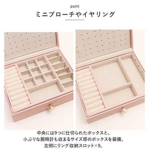 | 商品説明 | お気に入りのアクセサリーがスッキリ収納できる!大容量ジュエリーボックス。【捻り金具開口】カンタン開閉!しっかりロックできて、中身がこぼれ落ちる心配なし◎【上品なデザイン】シンプルなフェイクレザー素材のボックス。キラッと輝く金具がアクセント♪【傷付きを防止】ベロアのような素材の内張り仕様。【見やすくたっぷり収納できる!】なくしがちなアクセサリーをまとめて整理整頓◎【フタ裏】ネックレスが8本掛けられる!チェーンが絡まず収納できるギャザーポケット付き。《上段》【ピアス】扉状プレートには合計40組のピアスを収納。右側に取り外し可能な5つ穴プレート×5。【リング】左側にリング収納スロット×9。【ミニブローチやイヤリング】中央には9つに仕切られたボックスと、小ぶりな腕時計も収まるサイズ感のボックスを装備。《下段》【腕時計やバングル】・6つに仕切られたボックス。サッと取り出せて便利。 |