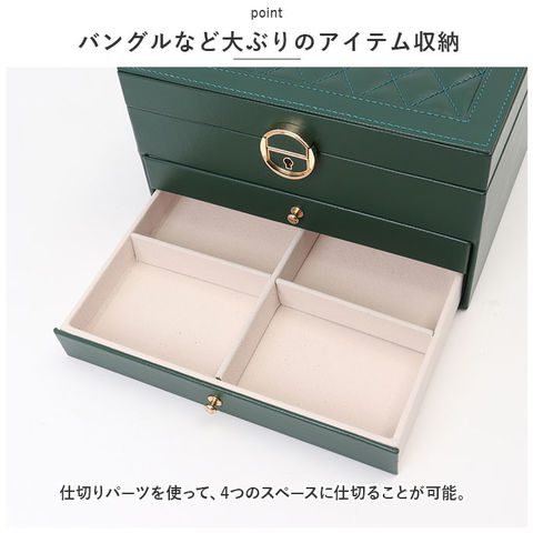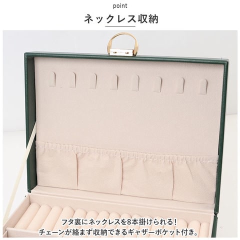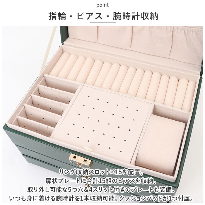 | 商品説明 | お気に入りのアクセサリーをスッキリと収納できる、3段ジュエリーボックス♪【見やすくたっぷり収納!】なくしがちなアクセサリーをまとめて整理整頓◎【ワンタッチ開閉】開口部のリング状金具を上げるだけで簡単オープン。戻す時は、カチッと鳴るまで下げるだけ。【鍵付きで安心】大切なアクセサリーを保管するのに最適◎【傷付きを防止】柔らかな起毛素材の底面内張り仕様。《上部の収納スペース》【出し入れがスムーズ】パカッと大きく開いてサッと出し入れOK♪【ネックレス収納】フタ裏にネックレスを8本掛けられる!チェーンが絡まず収納できるギャザーポケット付き。【指輪収納】リング収納スロット×15を配置。【ピアス収納】扉状プレートに合計15組のピアスを収納。取り外し可能な5つ穴&4スリット付きのプレートも装備。【フリースペース】扉状プレート下部に9個に仕切られたボックスを装備。【腕時計】いつも身に着ける腕時計を1本収納可能。クッションパッドが1つ付属。《引き出し1段目》【イヤリングやミニブローチ】・20個に仕切られたボックスに見やすく収納!《引き出し2段目》【バングルなど大ぶりのアイテム】仕切りパーツを使って、4つのスペースに仕切ることが可能。 |