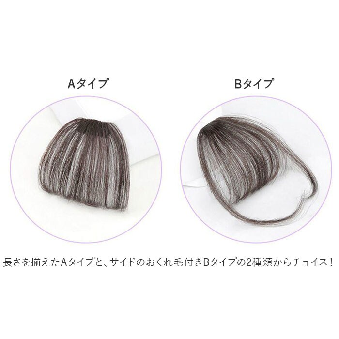 | 商品説明 | ワンタッチで手軽にイメチェンできる前髪ウィッグ♪ツヤ感を抑え、馴染みやすい人工毛を使用。クリップでパチンっと留めるだけで、ナチュラルな前髪が完成♪流れるような毛先で、より自然な印象に。長さを揃えたAタイプと、サイドのおくれ毛付きBタイプの2種類からチョイス!前髪についた寝癖が取れない時にもおすすめ。 |