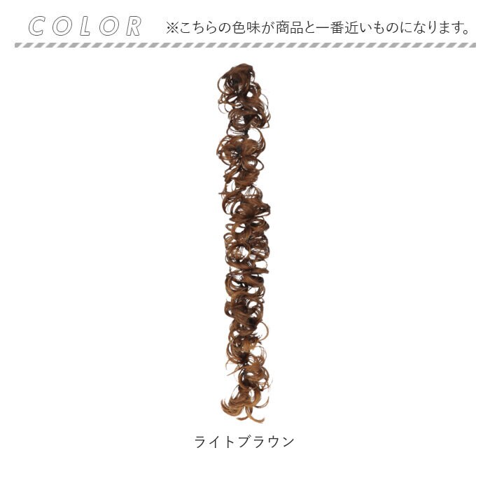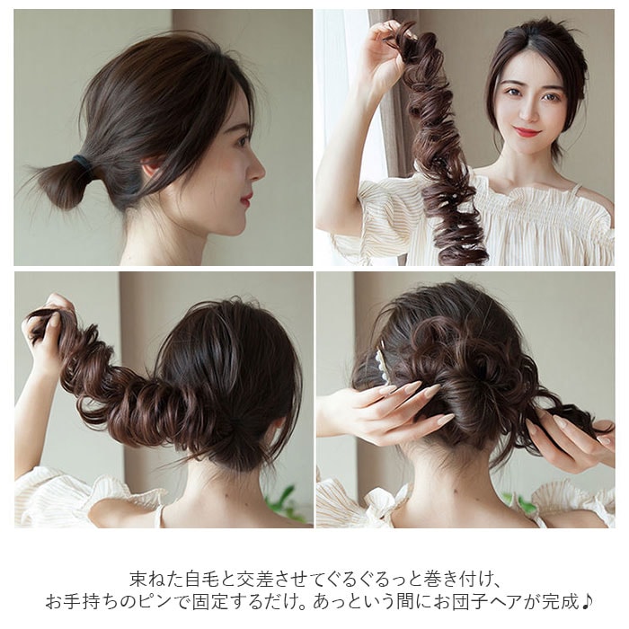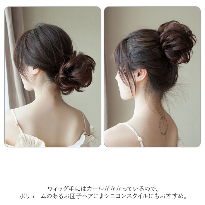 | 商品説明 | 誰でも手軽におだんごスタイルを楽しめるウィッグ♪柔らかく自然な艶感のある人毛を採用。束ねた自毛と交差させてぐるぐるっと巻き付け、お手持ちのピンで固定するだけ。あっという間にお団子ヘアが完成♪ウィッグ毛にはカールがかかっているので、ボリュームのあるお団子ヘアに♪シニヨンスタイルにもおすすめ。ヘアアレンジが苦手な方にもぴったりのアイテム! |