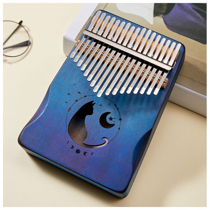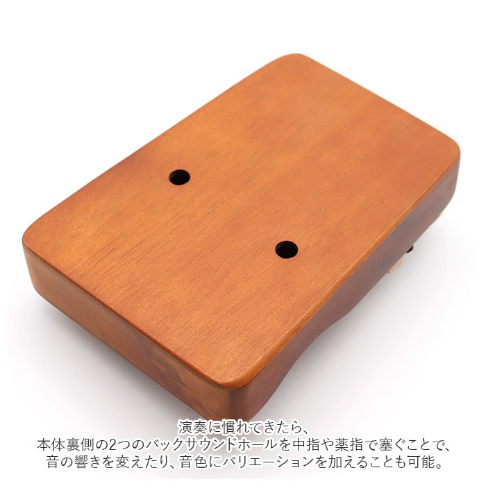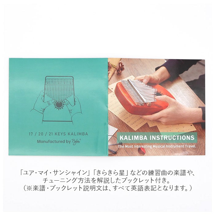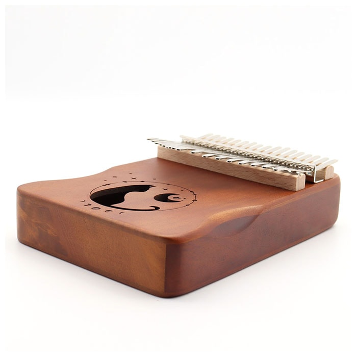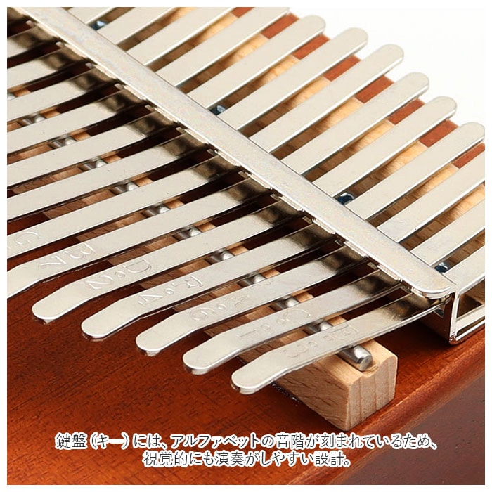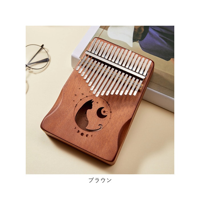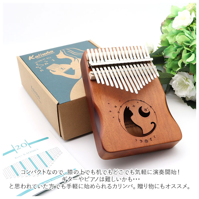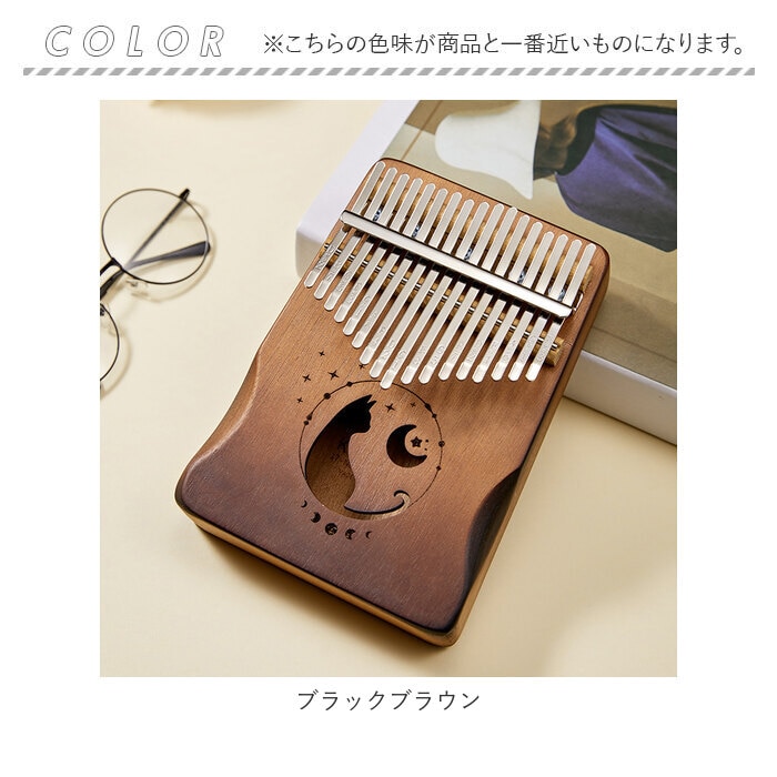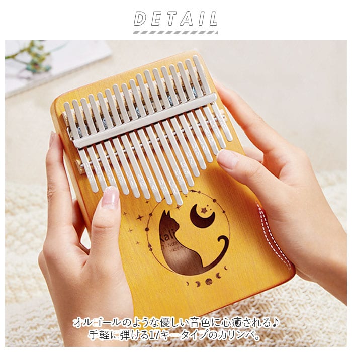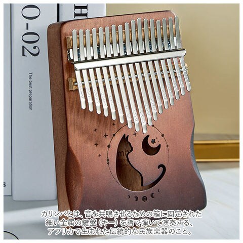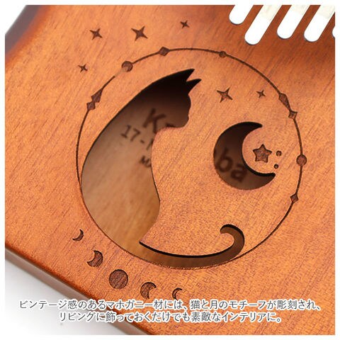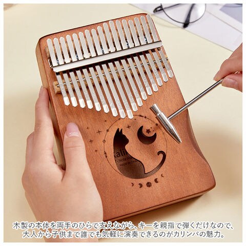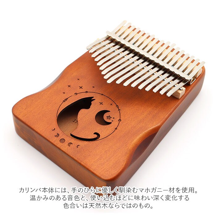 | 商品説明 | オルゴールのような優しい音色に心癒される♪手軽に弾ける17キータイプのカリンバ。カリンバとは、音を共鳴させるための箱に固定された細い金属の鍵盤(キー)を指で弾いて演奏する、アフリカで生まれた伝統的な民族楽器のこと。木製の本体を両手のひらで支えながら、キーを親指で弾くだけなので、大人から子供まで誰でも気軽に演奏できるのがカリンバの魅力。カリンバ本体には、手のひらに優しく馴染むマホガニー材を使用。温かみのある音色と、使い込むほどに味わい深く変化する色合いは天然木ならではのもの。鍵盤(キー)には、アルファベットの音階が刻まれているため、視覚的にも演奏がしやすい設計。演奏に慣れてきたら、本体裏側の2つのバックサウンドホールを中指や薬指で塞ぐことで、音の響きを変えたり、音色にバリエーションを加えることも可能。・「ユア・マイ・サンシャイン」「きらきら星」などの練習曲の楽譜や、チューニング方法を解説したブックレット付き。(※楽譜・ブックレット説明文は、すべて英語表記となります。)演奏時の視認性をアップさせる2色のキーステッカー、キー調律用ハンマー、お手入れ用クロスも付属し、メンテナンス用ツールも充実。ビンテージ感のあるマホガニー材には、猫と月のモチーフが彫刻され、リビングに飾っておくだけでも素敵なインテリアに。コンパクトなので、膝の上でも机でもどこでも気軽に演奏開始!ギターやピアノは難しいかも・・・と思われていた方でも手軽に始められるカリンバ。贈り物にもオススメ。 |