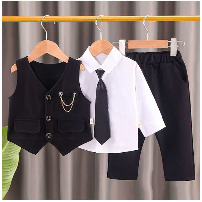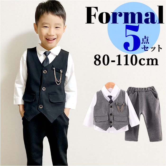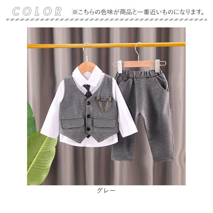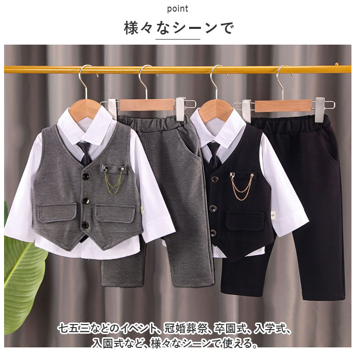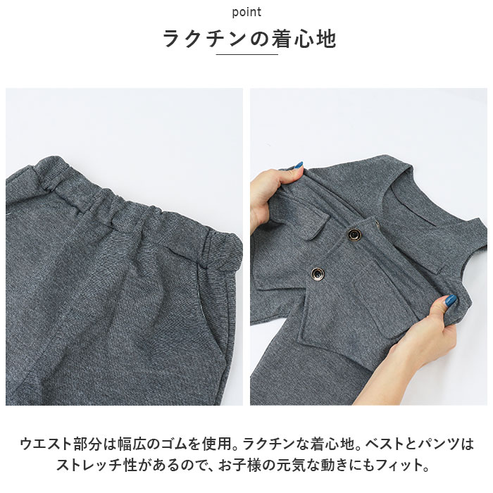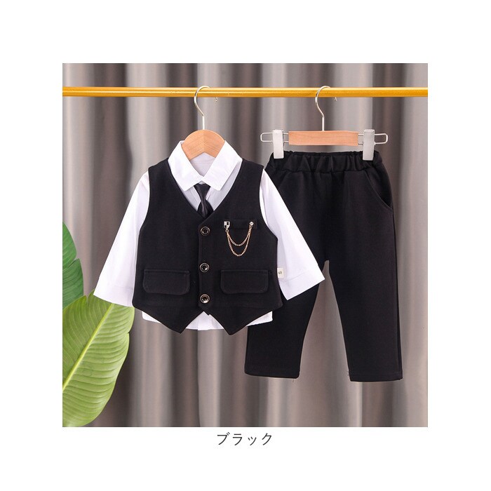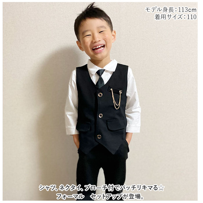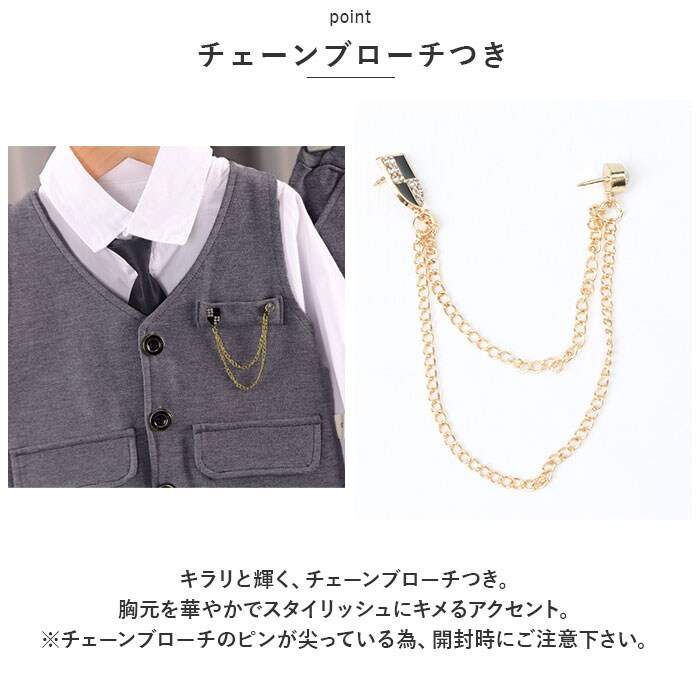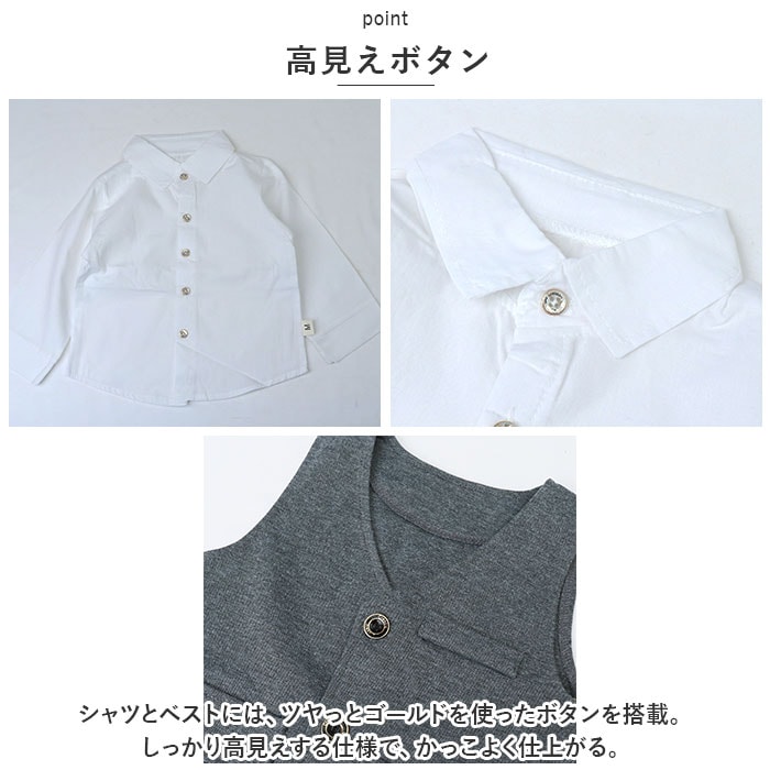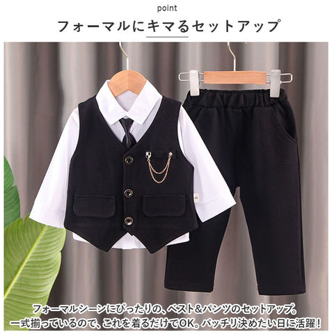 | 商品説明 | シャツ、ネクタイ、ブローチ付でバッチリキマる☆フォーマル セットアップが登場。【フォーマルにキマるセットアップ】フォーマルシーンにぴったりの、ベスト&パンツのセットアップ。一式揃っているので、これを着るだけでOK。バッチリ決めたい日に活躍!【ワンタッチネクタイ】ネクタイ結びが完成している、ゴム仕様のネクタイがセットに。首に通すだけのワンタッチネクタイなので、苦しくなく簡単に着けられる!【高見えボタン】シャツとベストには、ツヤっとゴールドを使ったボタンを搭載。しっかり高見えする仕様で、かっこよく仕上がる。【ラクチンの着心地】ウエスト部分は幅広のゴムを使用。ラクチンな着心地。ベストとパンツはストレッチ性があるので、お子様の元気な動きにもフィット。【チェーンブローチつき】キラリと輝く、チェーンブローチつき。胸元を華やかでスタイリッシュにキメるアクセント。※チェーンブローチのピンが尖っている為、開封時にご注意下さい。【様々なシーンで】七五三などのイベント、冠婚葬祭、卒園式、入学式、入園式など、様々なシーンで使える。 |