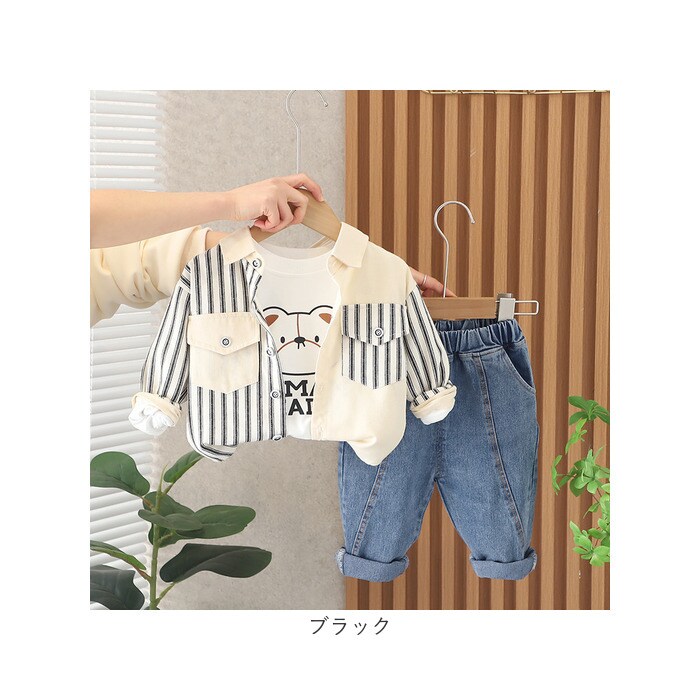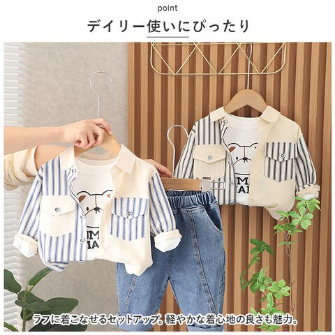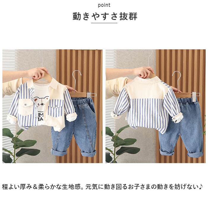 | 商品説明 | おしゃれキッズにぴったり☆これだけでコーデが完成する、カジュアルセットアップが新登場。【着回し力ばっちりな3点セット】長袖トップス、長袖シャツ、デニムパンツのセット。一緒に合わせるのはもちろん、ぞれぞれ単体使いもできてコーデの幅が広がるアイテム。【可愛らしい長袖トップス】フロントに愛らしいクマさんの絵柄をプリント☆首元が詰まりすぎない、クルーネックタイプ。【ベーシックな長袖シャツ】フロントボタン付きの、スタンダードなカタチに仕立てたシャツ。トップスの上にサッと羽織ったり、1枚で着てもOK。左右の胸元にはポケットをプラス。【ストレスなく履けるロングパンツ】締めつけ感の少ないウエストゴムで着替えがしやすく、自分サイズにフィット!裾をロールアップしてもおしゃれ。左右にポケット付き。【動きやすさ抜群】程よい厚み&柔らかな生地感。元気に動き回るお子さまの動きを妨げない♪【デイリー使いにぴったり】ラフに着こなせるセットアップ。軽やかな着心地の良さも魅力。 |