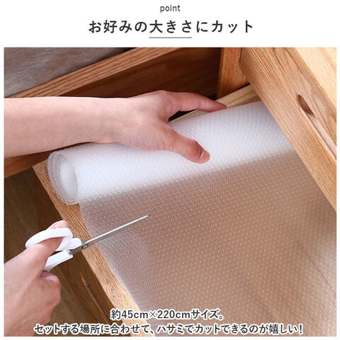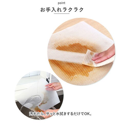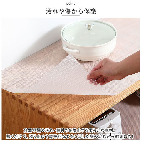 | 商品説明 | 様々な場所で活躍する保護シートが登場。【シンプルなデザイン】使い勝手の良いワンカラーデザイン。用途ごとに色違いで揃えてもOK。【汚れや傷から保護】食器や棚の汚れ・傷付きを防止する柔らかな素材。敷くだけで、滑り止めや調味料などをこぼした際の流れ込み対策にも!【お好みの大きさにカット】約45cm×220cmサイズ。セットする場所に合わせて、ハサミでカットできるのが嬉しい!【お手入れラクラク】汚れたら、サッと水拭きするだけでOK。【キッチン以外でも】靴箱やお部屋のキャビネット、クローゼットの引き出しなどにもおすすめ。 |