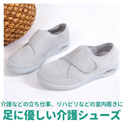 | 商品説明 | 足に優しいつくり。介護などの立ち仕事、リハビリなどの室内履きに。介護シューズが登場。【足に優しいシューズ】足に優しい柔らかなつくり。ストレッチ性に優れたメッシュのアッパー、クッション性のあるかかと部分、立体インソールなど、履きやすい工夫がたくさんのアイテム。【ぷっくりエアーソール】地面からの衝撃をしっかり吸収してくれるぷっくりエアーソールを搭載。足にかかる負担を軽減し、疲れにくい◎【通気性◎】メイン素材はメッシュのような仕様になっており、通気性に優れたアイテム。長時間の立ち仕事や、リハビリなどのシーンでも靴内が快適。【履きやすい】面ファスナー仕様のガバっと大きく開く履き口。どんなシーンでも着脱がラクチンなのも嬉しいポイント。【滑りにくい】靴裏には滑りにくいよう加工を施し、歩きやすさに配慮。屋外もフローリングもしっかりグリップしてくれる安心の仕様。【シンプルデザイン】お洋服やシーンを選ばない、シンプルなデザイン。ユニセックスで、エイジレスで使える☆【外せるインソール】インソールは取り外しOK。いつでも気軽に洗えるのが嬉しいポイント。 |
