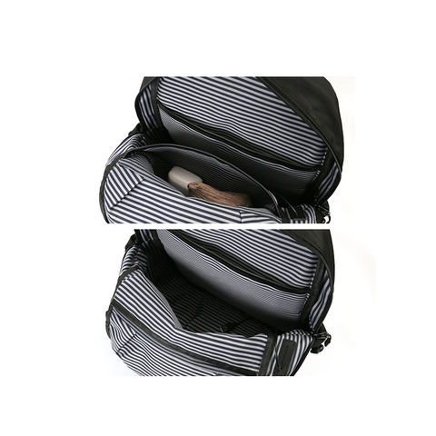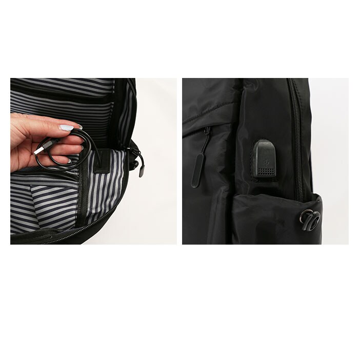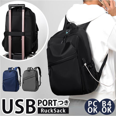 | 商品説明 | ユニセックスで使えるリュックサックが発売。斜めにカットされたフロントのファスナーポケットがさりげないアクセント♪メインルームはB4対応。ダブルファスナー仕様で大きく開き、中の荷物を出し入れしやすい作り。メインルーム内には背面側に、タブレット機器を入れるのに便利なクッション材入りポケットとフロント側に荷物を分けてしまえるオープンポケットを搭載。両サイドに500mlペットボトルや折りたたみ傘を挿して収納できる深めのオープンポケットを1つずつ配置。上部にはイヤホンホール、右サイドには充電に便利なUSBポート機能を装備。お手持ちのモバイルバッテリーをカバンの中に入れたままでも充電可能!(※イヤホンホールは必要に応じてご自身で穴を開ける仕様になります)リュック背面にはキャリーケースと一緒に持ち運べるキャリーオンベルト付き♪旅行時のサブバッグとしても大活躍!長さ調節が可能なショルダーベルトの裏側には、長時間背負っても肩の負担を軽減してくれるメッシュ素材のクッション付き。通勤通学はもちろん、マザーズバッグにもオススメなアイテム☆ |