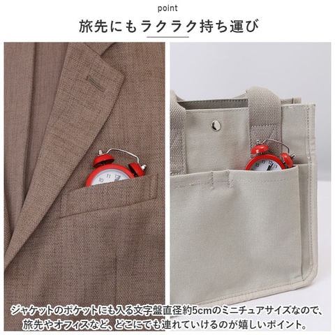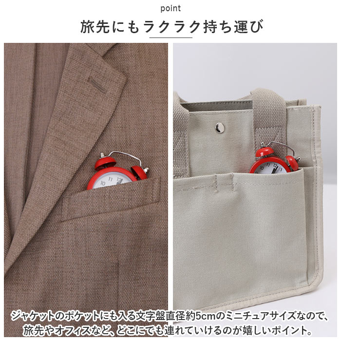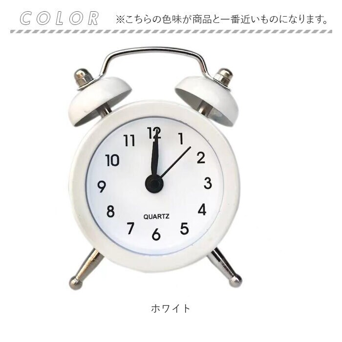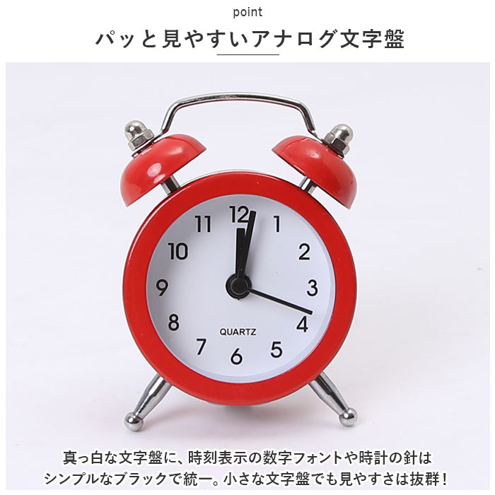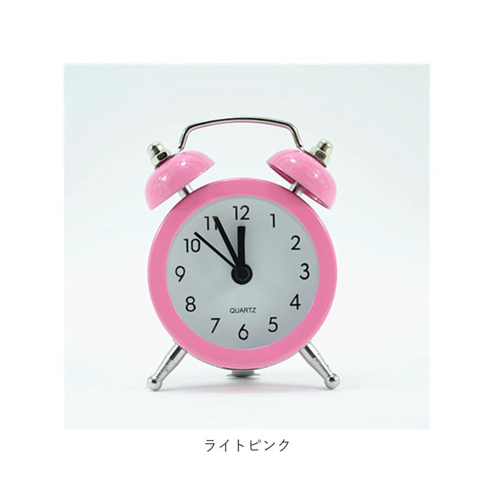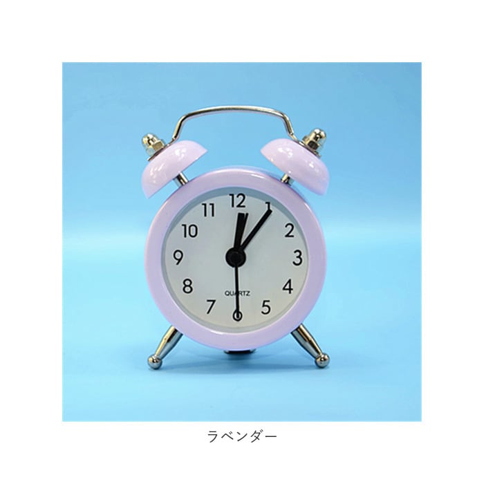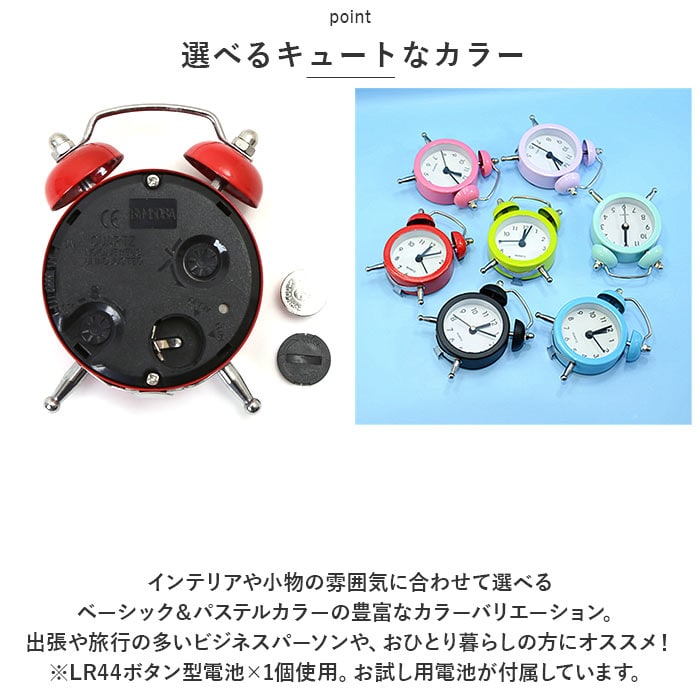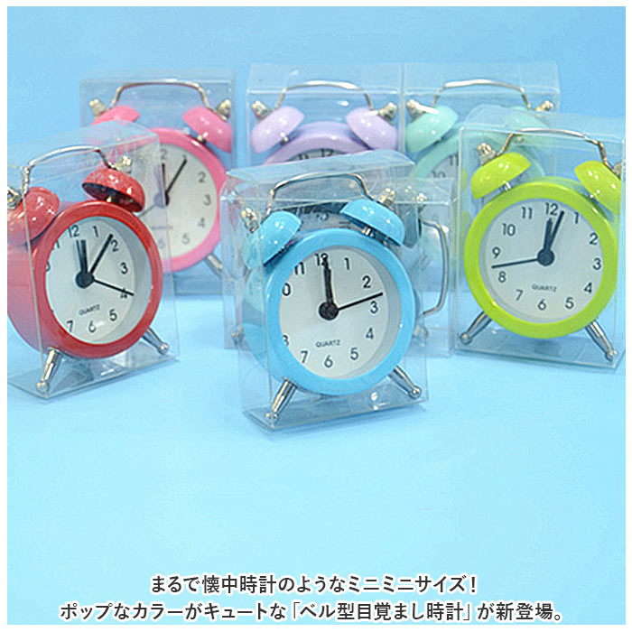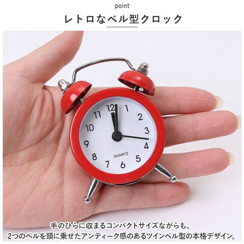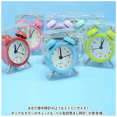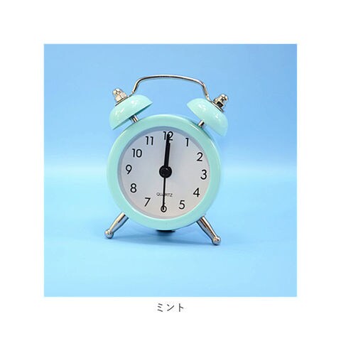 | 商品説明 | まるで懐中時計のようなミニミニサイズ!ポップなカラーがキュートな「ベル型目覚まし時計」が新登場。【レトロなベル型クロック】手のひらに収まるコンパクトサイズながらも、2つのベルを頭に乗せたアンティーク感のあるツインベル型の本格デザイン。【パッと見やすいアナログ文字盤】真っ白な文字盤に、時刻表示の数字フォントや時計の針はシンプルなブラックで統一。小さな文字盤でも見やすさは抜群!【アラームですっきりウェイクアップ】・「ピピピピッ、ピピピピッ」と可愛く鳴り響くアラームで、早起きの苦手なお寝坊さんでも毎朝の目覚めがスッキリ爽快。(※アラーム時刻設定用の目盛りは12分単位になります。アラーム設定をする際にお気をつけください。)【旅先にもラクラク持ち運び】カバンやジャケットのポケットにも入る文字盤直径約5cmのミニチュアサイズなので、旅先やオフィスなど、どこにでも連れていけるのが嬉しいポイント。【選べるキュートなカラー】インテリアや小物の雰囲気に合わせて選べるベーシック&パステルカラーの豊富なカラーバリエーション。出張や旅行の多いビジネスパーソンや、おひとり暮らしの方にオススメ!(※LR44ボタン型電池×1個使用。お試し用電池が付属しています。) |