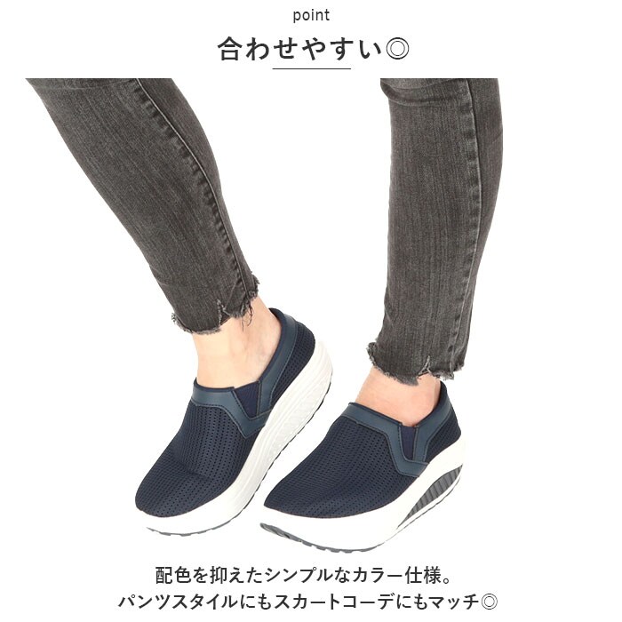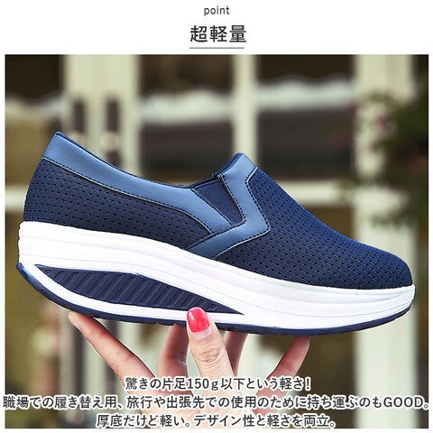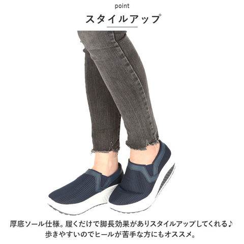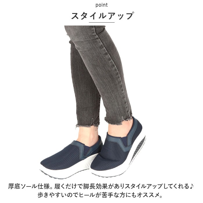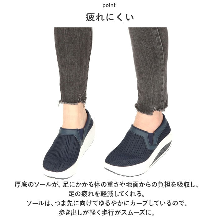 | 商品説明 | 厚底タイプでスタイルアップ♪抜群のクッション性と超軽量設計。「レディース 厚底 スニーカー」が登場!【超軽量】驚きの片足150g以下という軽さ!職場での履き替え用、旅行や出張先での使用のために持ち運ぶのもGOOD。厚底だけど軽い。デザイン性と軽さを両立。【スタイルアップ】厚底ソール仕様。履くだけで脚長効果がありスタイルアップしてくれる♪歩きやすいのでヒールが苦手な方にもオススメ。【疲れにくい】厚底のソールが、足にかかる体の重さや地面からの負担を吸収し、足の疲れを軽減してくれる。ソールは、つま先に向けてゆるやかにカーブしているので、歩き出しが軽く歩行がスムーズに。【快適な靴内】通気性に配慮し、アッパー部分にはメッシュ素材を採用。1日中履いてもムレにくく、快適な靴内をキープ!インソールは外してお洗濯OK。いつでも清潔に保てるのも嬉しいポイント。【スリッポンタイプ】履き口にはゴムを使用し、よりスムーズな着脱ができるスリッポンタイプ。紐レスなので、結び直す手間いらず。アッパー部分は柔らかく、足にフィットしてくれるので、幅広さんにもオススメ。【滑り止めつき】靴底には滑り止め加工を施し、雨の日の濡れた地面でも安心して歩行できる。【合わせやすい◎】配色を抑えたシンプルなカラー仕様。パンツスタイルにもスカートコーデにもマッチ◎定番カラーからポップなカラーまで、お好きなカラーをチョイスして、楽しくお出かけ♪ |