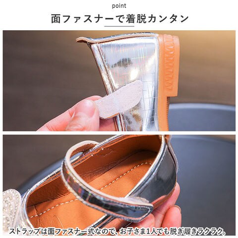 | 商品説明 | 足元もおしゃれに♪キュートなフォーマルシューズが登場。【可愛さアップのポイント】光沢のあるミラーのような仕上がり。つま先部分に配置された立体的なリボンが印象的で、キラッと光るストーンもプラス。【面ファスナーで着脱カンタン】ストラップは面ファスナー式なので、お子さま1人でも脱ぎ履きラクラク。【歩きやすさが向上】屈曲性があり、つま先にかけてやや上を向いた形状。つまづきにくく、蹴り上げやすい!【安定感のあるソール】前後の差を抑えたほぼフラットなソール。滑りにくい素材で、濡れた路面でも安心。【フォーマルシーンで】発表会やパーティーなどのお呼ばれシーンで大活躍! |