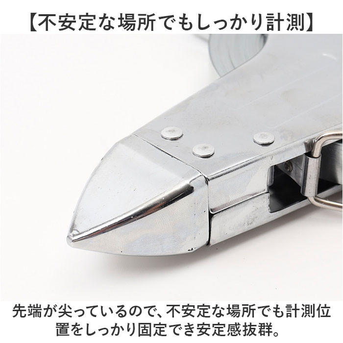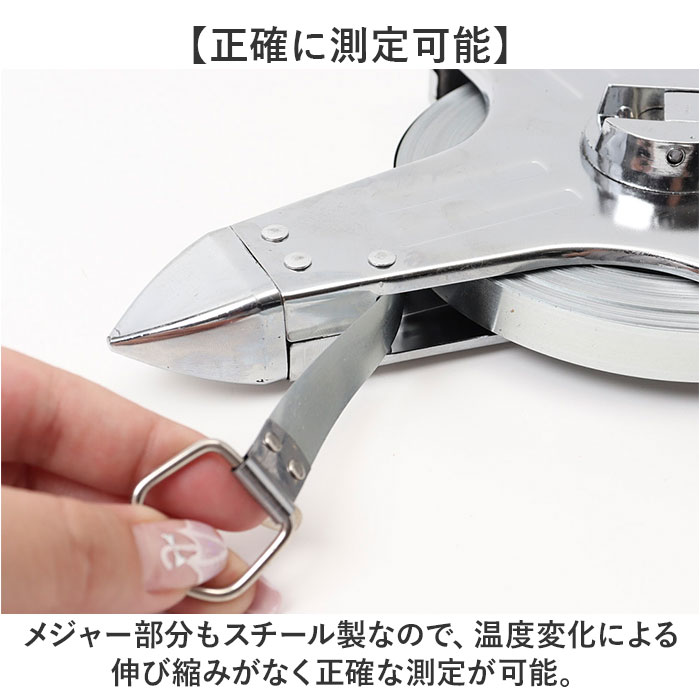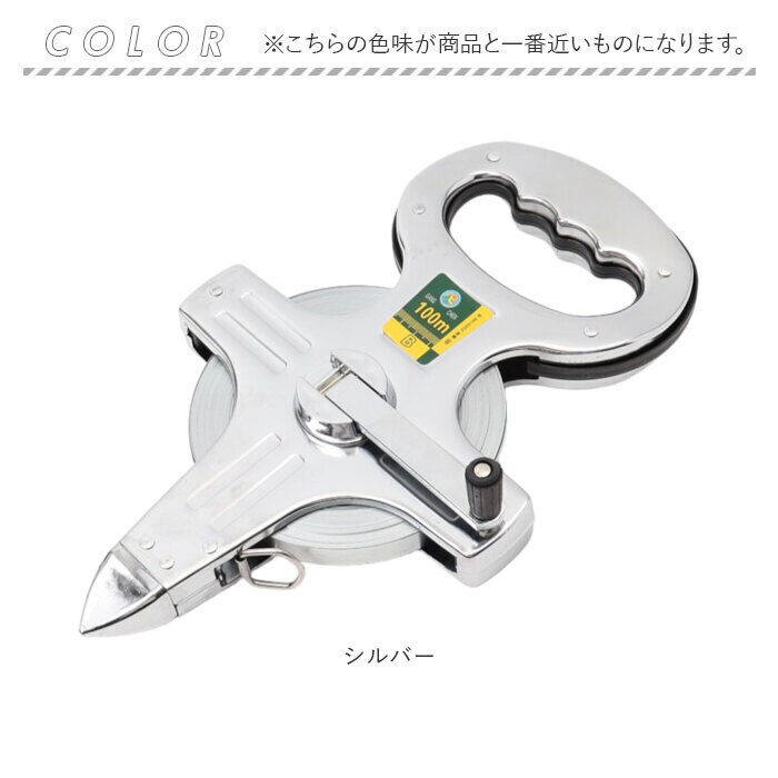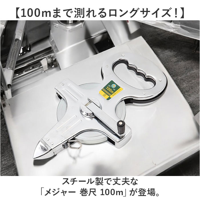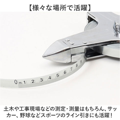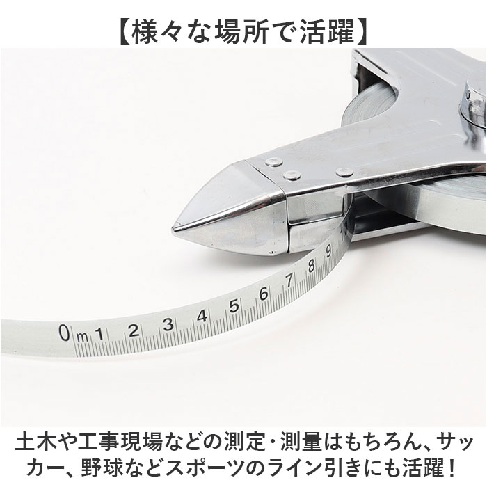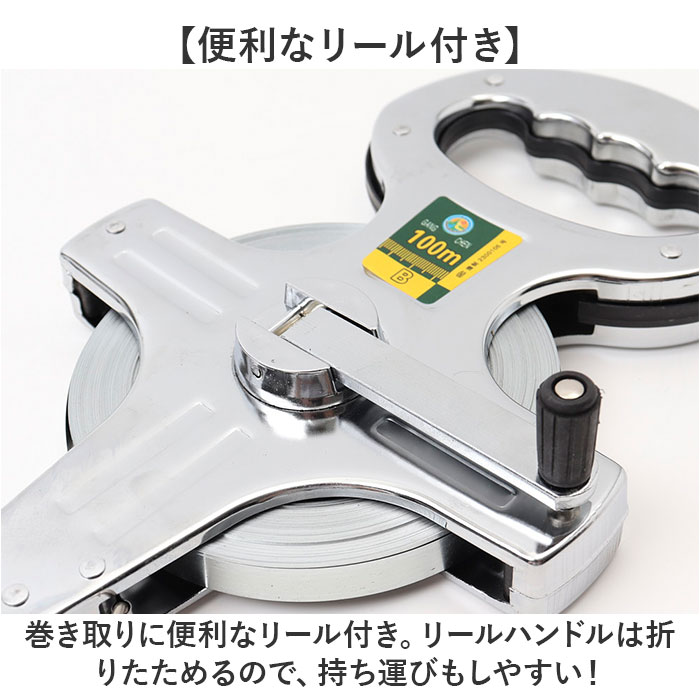 | 商品説明 | 【100mまで測れるロングサイズ!】スチール製で丈夫な「メジャー 巻尺 100m」が登場。【様々な場所で活躍】土木や工事現場などの測定・測量はもちろん、サッカー、野球などスポーツのライン引きにも活躍!【不安定な場所でもしっかり計測】先端が尖っているので、不安定な場所でも計測位置をしっかり固定でき安定感抜群。【正確に測定可能】メジャー部分もスチール製なので、温度変化による伸び縮みがなく正確な測定が可能。(※)ケガ防止のため必ず手袋をご使用ください。【便利なリール付き】巻き取りに便利なリール付き。リールハンドルは折りたためるので、持ち運びもしやすい! |