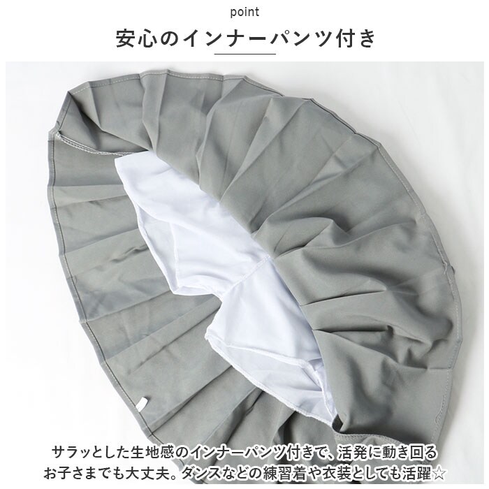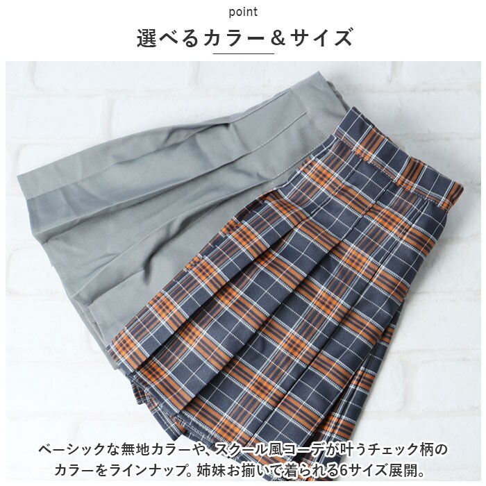 | 商品説明 | スッキリ着こなせる♪おしゃれキッズにぴったりな、ミニプリーツスカートが登場。【フレアなAラインシルエット】プリーツが裾に向けて、ふんわり広がるシルエット。女の子らしい印象を演出♪【ストレスフリーな着心地】内側のボタン穴付きゴムを使って、若干のサイズ調節が可能。締めつけを感じにくいバックゴム仕様で自分サイズにフィットし、フロントからの見た目もすっきり。【安心のインナーパンツ付き】サラッとした生地感のインナーパンツ付きで、活発に動き回るお子さまでも大丈夫。ダンスなどの練習着や衣装としても活躍☆【選べるカラー&サイズ】ベーシックな無地カラーや、スクール風コーデが叶うチェック柄のカラーをラインナップ。姉妹お揃いで着られる6サイズ展開。 |