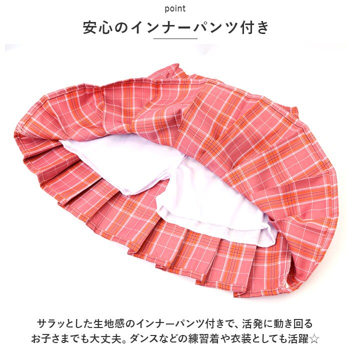 | 商品説明 | おしゃれキッズにぴったり。スクール風コーデが叶う、ミニプリーツスカートが登場。【フレアなAラインシルエット】プリーツが裾に向けて、ふんわり広がるシルエット。女の子らしい印象を演出♪【存在感のあるチェック柄】制服のスカートのようなチェックデザイン。お手持ちのシャツと合わせて、おしゃれにコーディネート♪【安心のインナーパンツ付き】サラッとした生地感のインナーパンツ付きで、活発に動き回るお子さまでも大丈夫。ダンスなどの練習着や衣装としても活躍☆【自分サイズにフィット】締めつけを感じにくいバックゴム仕様で、心地よくフィット。フロントからの見た目もすっきり!【選べるカラー&サイズ】カラーごとに表情が異なるので、お気に入りをチョイスして☆姉妹お揃いで着られる6サイズ展開。 |