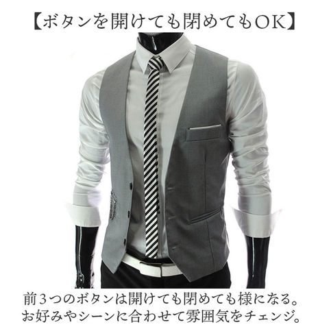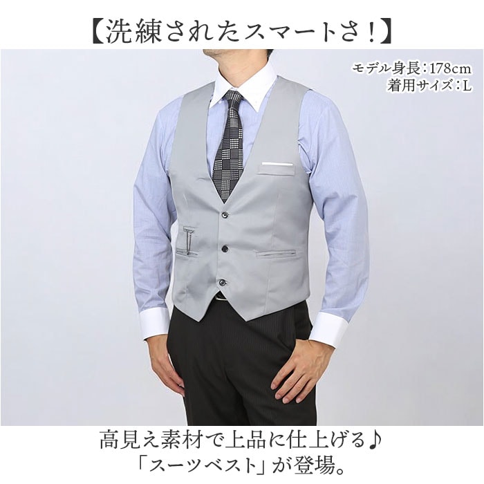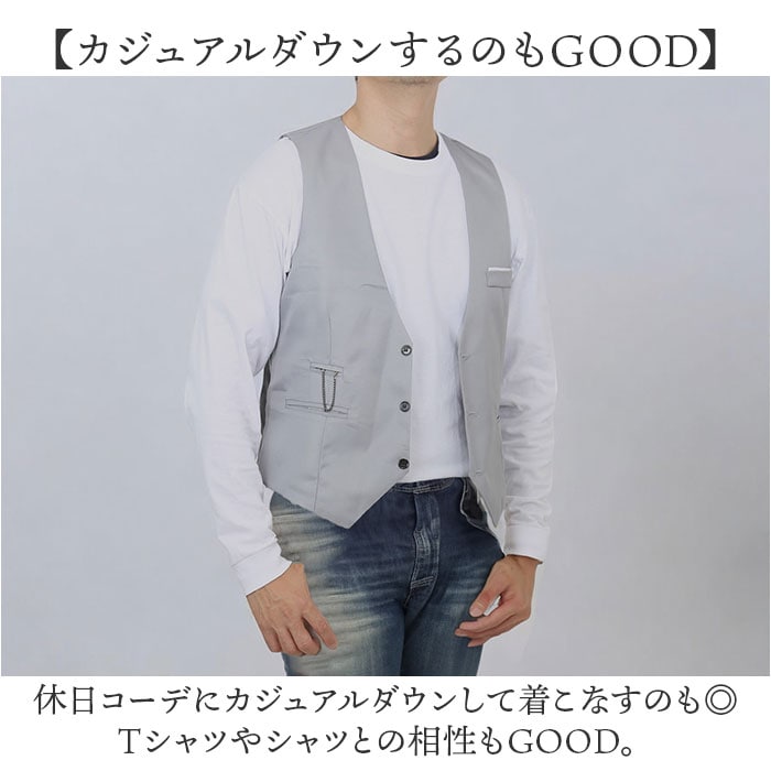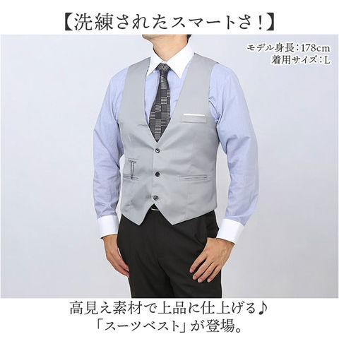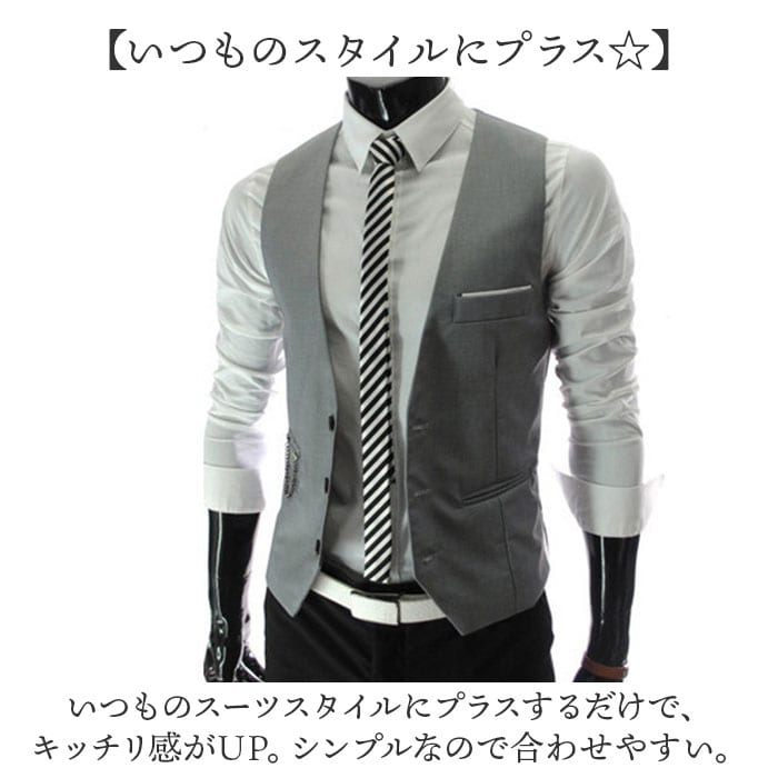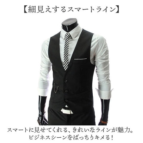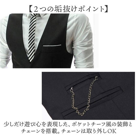 | 商品説明 | 【洗練されたスマートさ!】高見え素材で上品に仕上げる♪「スーツベスト」が登場。【細見えするスマートライン】スマートに見せてくれる、きれいなラインが魅力。ビジネスシーンをばっちりキメる!【いつものスタイルにプラス☆】いつものスーツスタイルにプラスするだけで、キッチリ感がUP。シンプルなので合わせやすい。【カジュアルダウンするのもGOOD】休日コーデにカジュアルダウンして着こなすのも◎Tシャツやシャツとの相性もGOOD。【ボタンを開けても閉めてもOK】前3つのボタンは開けても閉めても様になる。お好みやシーンに合わせて雰囲気をチェンジ。【2つの垢抜けポイント】少しだけ遊び心を表現した、ポケットチーフ風の装飾とチェーンを搭載。チェーンは取り外しOK |