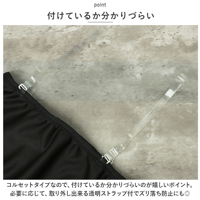 | 商品説明 | バストのボリュームを抑えてくれるナベシャツ。【様々なニーズに対応】スポーツやダンスの時に揺れて痛い、胸が大きくてコンプレックス、シャープなシルエットに憧れる、男装をしたい・・・そんなニーズにピッタリ★【軽い着心地】サラリとした軽い着心地♪ノンワイヤーで、締めつけ感なく着用できるインナー。【自分サイズに調節可能】バックの8連3段ホックで自分サイズに調節が可能。【付けているか分かりづらい】コルセットタイプなので、付けているか分かりづらいのが嬉しいポイント。必要に応じて、取り外し出来る透明ストラップ付でズリ落ち防止にも◎【心地よくホールド】フラットな生地感でバストを心地よくホールド。揺れを抑えてくれるので、スポーツ時にも活躍。 |