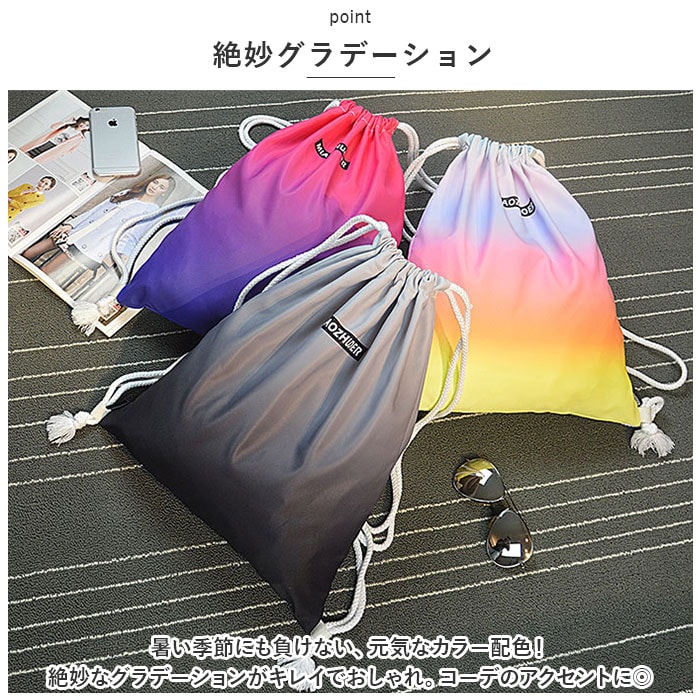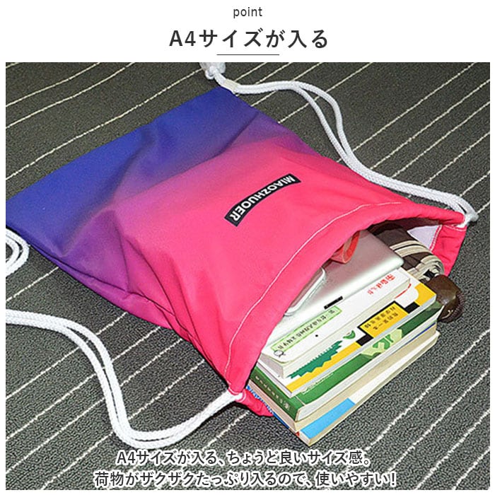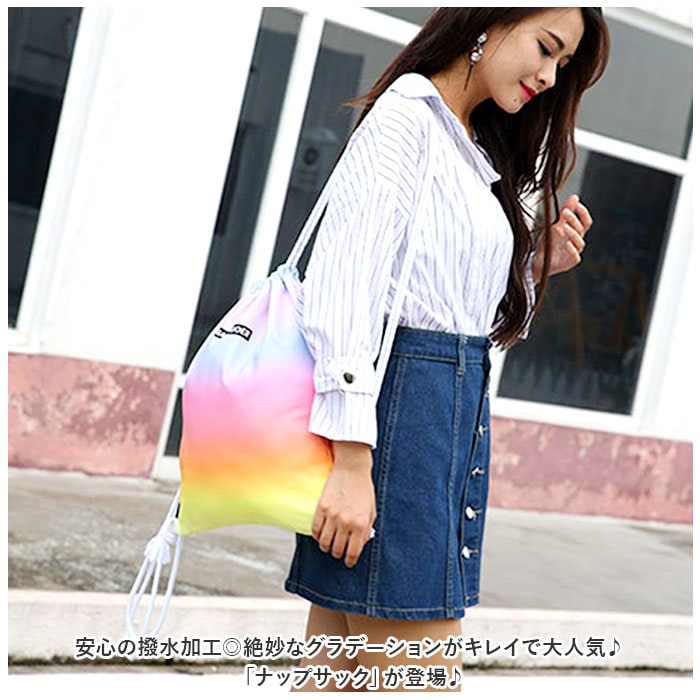 | 商品説明 | 安心の撥水加工◎絶妙なグラデーションがキレイで大人気♪「ナップサック」が登場♪【撥水加工】撥水加工を施したナップサック。プールバックやジムバック、シューズケースとしても◎レジャーシーンでも大活躍するアイテム!【絶妙グラデーション】暑い季節にも負けない、元気なカラー配色!絶妙なグラデーションがキレイでおしゃれ。コーデのアクセントに◎【A4サイズが入る】A4サイズが入る、ちょうど良いサイズ感。荷物がザクザクたっぷり入るので、使いやすい!【ミニポケットつき】メイン収納には、メッシュ素材のファスナーポケットつき!迷子になりがちな小物の収納ができ、中身が見えるので便利。【持ちやすさ◎】太めの肩紐仕様で、重たい荷物でも持ちやすさ◎紐は長さ調節が可能。【開口部はキュッと閉まる】開口部はキュッと閉まるので、中身が飛び出さずに安心。左右に引っ張るだけで閉まるので、お子さまも使いやすい。【選べるカラー】ユニセックス、エイジレスで使える、選べるカラ―展開。お子様から大人までお気に入りのカラーがきっと見つかる♪【ポケット仕様】メイン収納:ファスナーつきポケット×1 |