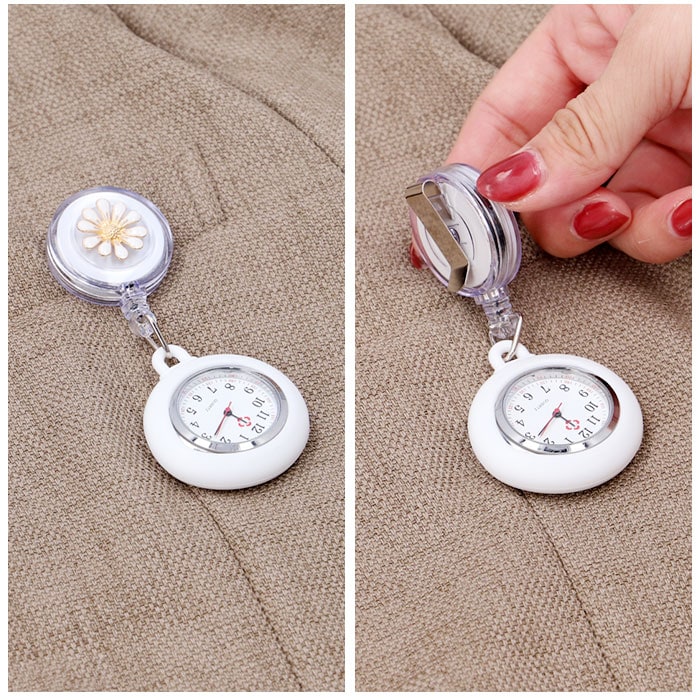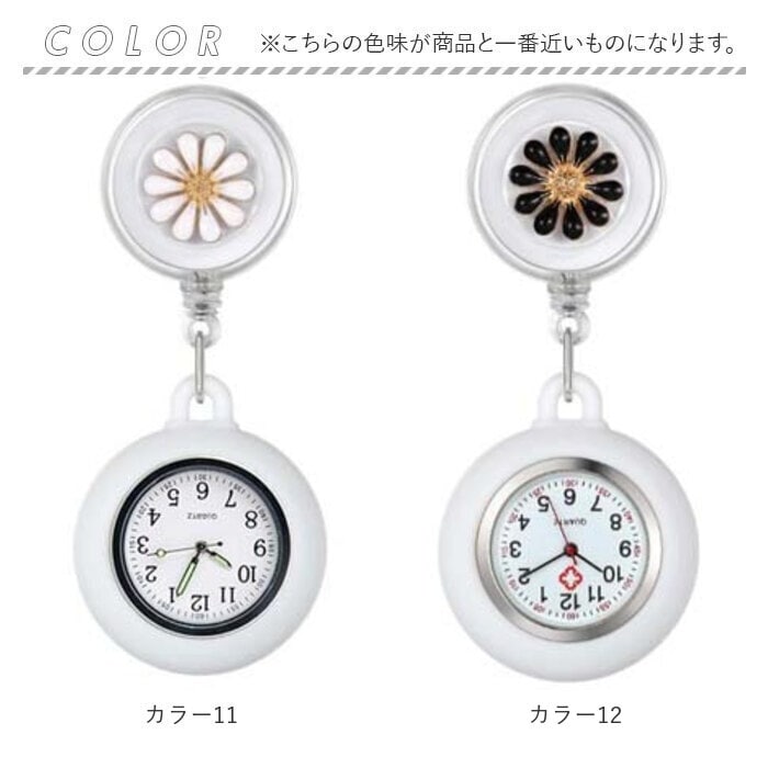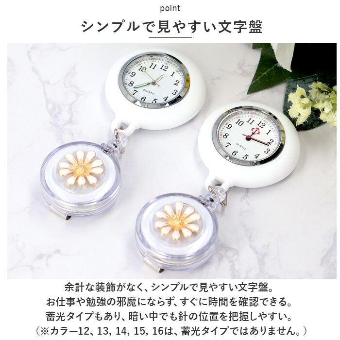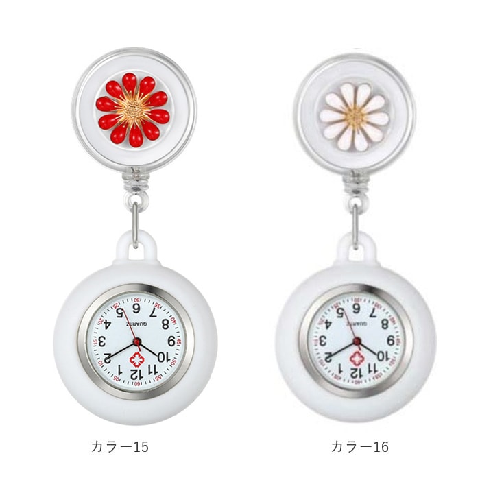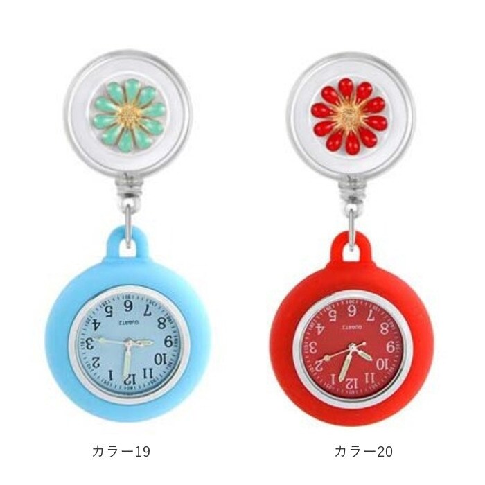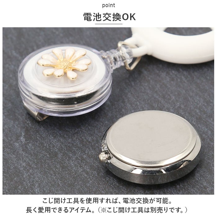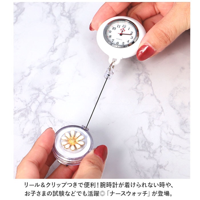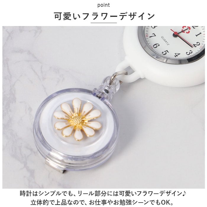| 商品説明 | リール&クリップつきで便利!腕時計が着けられない時や、お子さまの試験などでも活躍◎「ナースウォッチ」が登場。【リール&クリップ式】便利なリール&クリップ式。腕時計が着けられない時に、胸ポケットのフチなどに付けて使える◎リールタイプでサッと伸びて、ラクラク時間確認!【シリコンカバーつき】胸ポケットなどに付けてぶらさげても安全なシリコンカバーつき。手で持った時に滑りにくいのも魅力!【シンプルで見やすい文字盤】余計な装飾がなく、シンプルで見やすい文字盤。お仕事や勉強の邪魔にならず、すぐに時間を確認できる。蓄光タイプもあり、暗い中でも針の位置を把握しやすい。(※カラー12、13,14,15,16は、蓄光タイプではありません。)【電池交換OK】こじ開け工具を使用すれば、電池交換が可能。長く愛用できるアイテム。(※こじ開け工具は別売りです。)【可愛いフラワーデザイン】時計はシンプルでも、リール部分には可愛いフラワーデザイン♪立体的で上品なので、お仕事やお勉強シーンでもOK。【選べるカラー】シンプルなホワイトから、華やかなカラーまで豊富にご用意。お気に入りがきっと見つかる♪ |