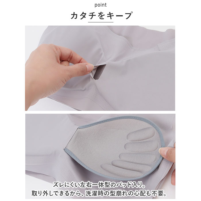 | 商品説明 | 身体にかかる負担を軽減!程よいフィット感のナイトブラが新登場。【ストレスフリー◎】締めつけ感のないノンワイヤー設計!窮屈感が苦手な方にぴったり。【シームレスタイプ】薄手のトップスにも響きにくい、縫い目のないつくり。【オールシーズン活躍】サラッとした手触りで、汗ばむ季節もムレにくく快適。【脇高設計】バストの揺れを抑え、横流れを防止。【カタチをキープ】ズレにくい左右一体型のパッド入り。取り外しできるから、洗濯時の型崩れの心配も不要。【着脱ラクチン】ホックなどがなく、頭から被るだけでOK。【シンプルなデザイン】装飾を省いたデザインで心地よい睡眠をサポート。 |