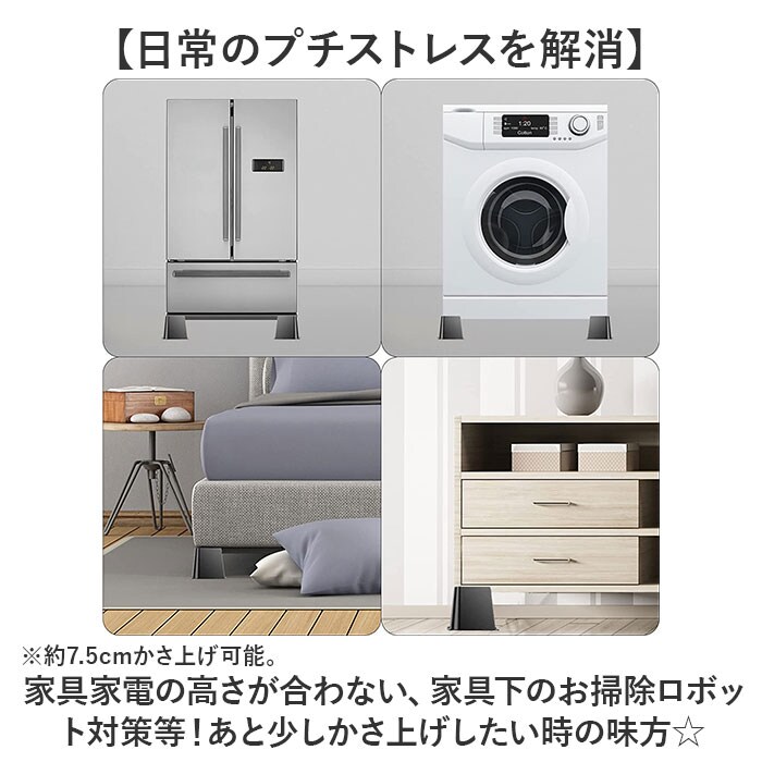 | 商品説明 | 【家具や家電の高さを簡単調節】お好みの高さに、安全に調節できて便利!どなたでも手軽に使える「継ぎ脚」4個セット。【日常のプチストレスを解消】家具家電の高さが合わない、家具下のお掃除ロボット対策等!あと少しかさ上げしたい時の味方☆(※)約7.5cmかさ上げ可能。【4点にセットできて安定感ばっちり】底面4点に取り付け可能。L字の縁で支え、家具や家電に当たる部分は滑りにくい形状で安心。【床を傷つけず、滑りにくい】底面4箇所に滑り止め付き。滑りにくく、床の傷付きやをガード。【防振・防音対策にも効果的】継ぎ脚を使うことで、床に伝わる振動なども軽減。マンション住まいの方にもおすすめ。【空間に馴染むシンプルデザイン】家具や家電と合わせやすく、雰囲気を壊さないデザイン&カラー。場所を選ばず使いやすい◎ |
