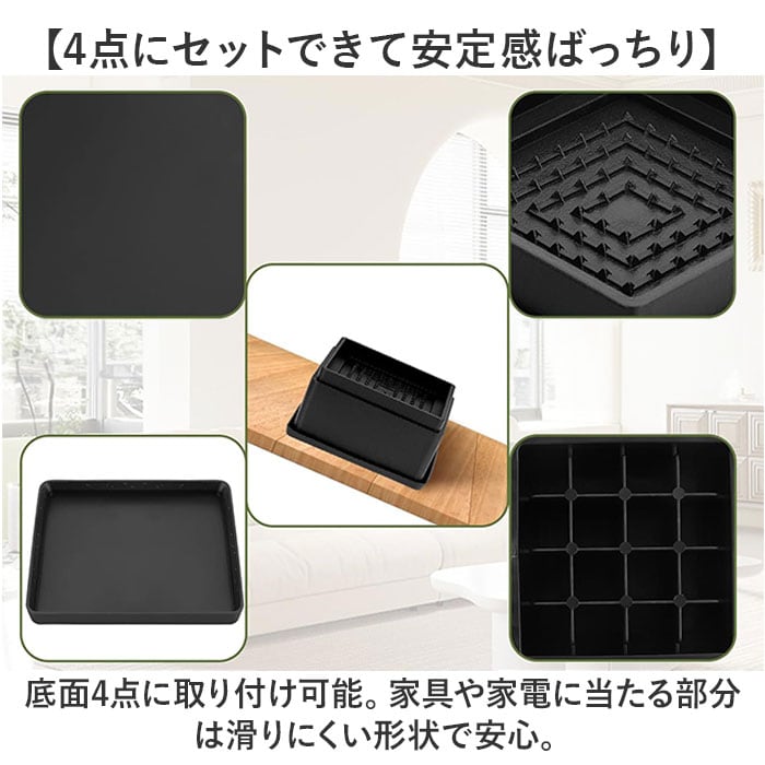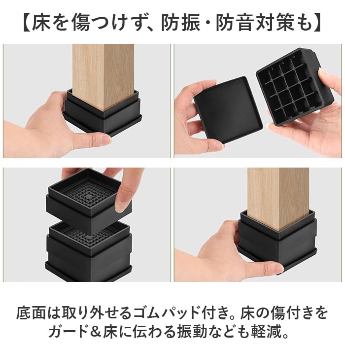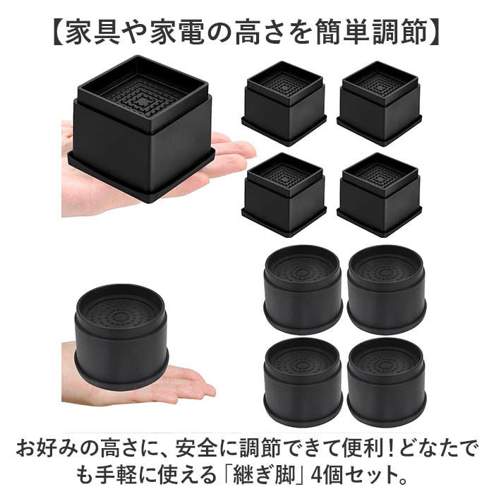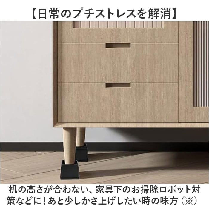 | 商品説明 | 【家具や家電の高さを簡単調節】お好みの高さに、安全に調節できて便利!どなたでも手軽に使える「継ぎ脚」4個セット。【日常のプチストレスを解消】机の高さが合わない、家具下のお掃除ロボット対策などに!あと少しかさ上げしたい時の味方☆(※)1つで約5cmかさ上げ可能。【4点にセットできて安定感ばっちり】底面4点に取り付け可能。家具や家電に当たる部分は滑りにくい形状で安心。【床を傷つけず、防振・防音対策も】底面は取り外せるゴムパッド付き。床の傷付きをガード&床に伝わる振動なども軽減。【2個までスタッキングもできて万能】さらに高さを上げたい時は、2段重ねて使用可能。継ぎ脚同志がしっかりハマるよう設計。(※)2段重ね以上は危険性があるため、ご注意ください。【脚の形状に合わせて選べる2タイプ】スクエアとラウンドの2タイプをご用意。お好みで選べるのがうれしい!【空間に馴染むシンプルデザイン】家具や家電と合わせやすく、雰囲気を壊さないデザイン&カラー。場所を選ばず使いやすい◎ |