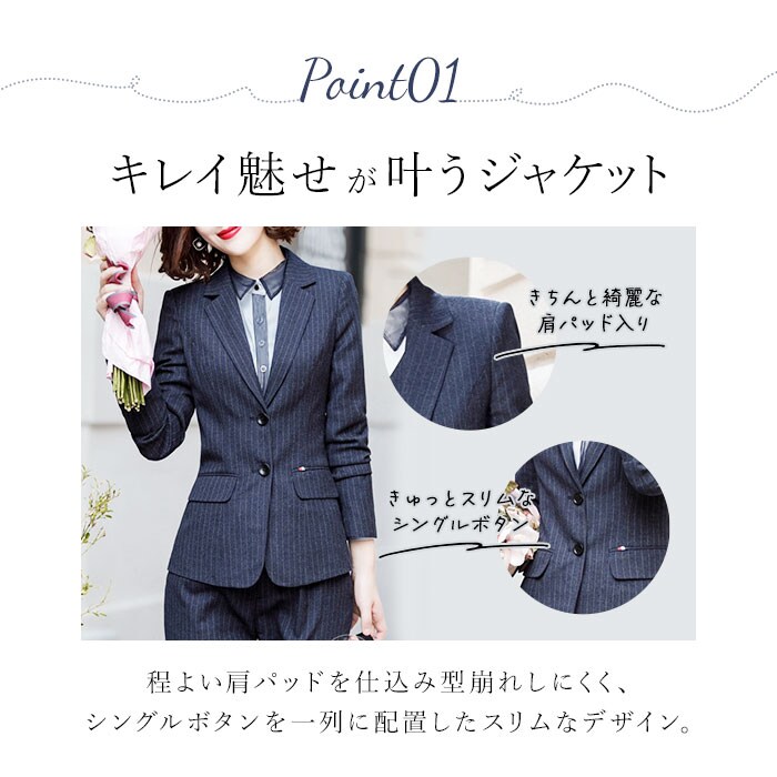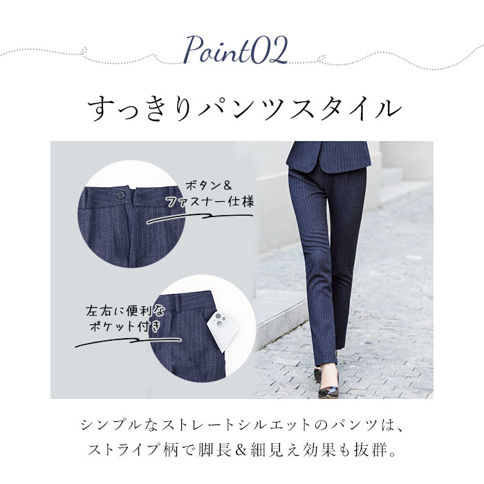 | 商品説明 | 【通勤やフォーマルシーンで活躍】使い勝手の良いベーシックデザイン。長く愛用できる、レディース用「ビジネススーツ」。【上品なキレイめスタイルが完成】シンプルできちんと感のあるジャケット&パンツ。スタイリッシュなストライプスデザイン。【すっきりフォルムのジャケット】肩パッドでシルエットをキープ&エレガントなラペルデザイン。スリムに魅せる絶妙な仕立て♪【ベーシックなシングルタイプ】フロントボタンを1列に配置し、スマートな印象を演出。左右にはフラップポケットを。(※)ポケットはご自身で糸を取ってご使用ください。【シンプルなストレートパンツ】すっと落ちて足元スラリ。フロントファスナー&ボタンで着脱でき、左右にポケット付き。【ロングシーズン使える万能アイテム】薄すぎず厚すぎない程よい生地感。ジャケットは裏地付で着用時のムレを軽減、摩擦からも保護。【インナー次第でおしゃれ上級者♪】デザイン性のあるブラウスなどで遊べば、さらに垢抜け!お好みで楽しめる☆【お子さまの学校行事にもおすすめ】フォーマルシーンにも馴染むデザイン。お子さまの入学・卒業式への参加もOK! |