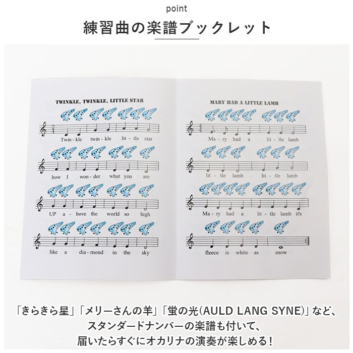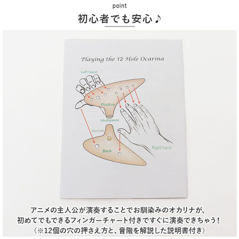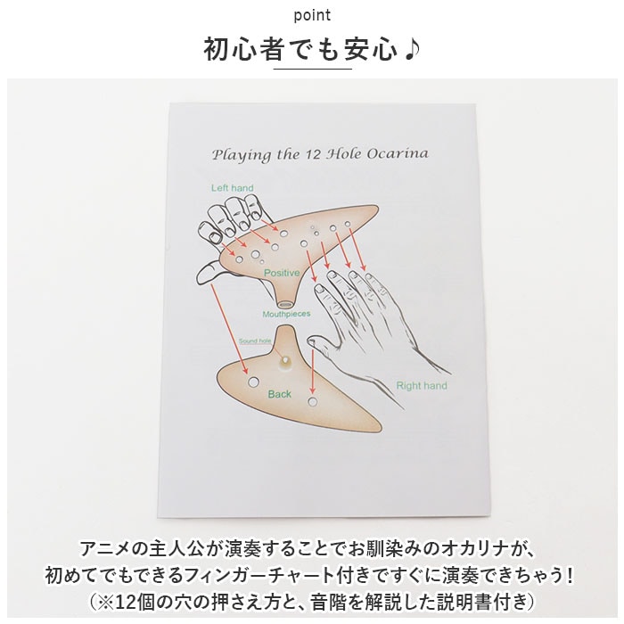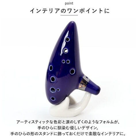 | 商品説明 | 初めてでも上手に吹ける!潤んだような光沢が美しい「オカリナ(12穴タイプ)」が新登場。【陶器ならではの美しい音色】深みのある上品な色合いの釉薬で丁寧に仕上げた、本格セラミック製のオカリナ。柔らかく温かみのある音色は、陶器ならではのもの。【初心者でも安心♪】アニメの主人公が演奏することでお馴染みのオカリナが、初めてでもできるフィンガーチャート付きですぐに演奏できちゃう!(※12個の穴の押さえ方と、音階を解説した説明書付き)【インテリアのワンポイントに】アーティスティックな色彩と涙のしずくのようなフォルムが、手のひらに馴染む優しいデザイン。手のひらの形のスタンドに飾っておくだけで素敵なインテリアに。【大切に持ち運べるケース付き】首に掛けて使えるストラップ紐が付属。クッション性のあるソフトケース付きなので、持ち運びも安心。【練習曲の楽譜ブックレット】「きらきら星」「メリーさんの羊」「蛍の光(AULD LANG SYNE)」など、スタンダードナンバーの楽譜も付いて、届いたらすぐにオカリナの演奏が楽しめる! |