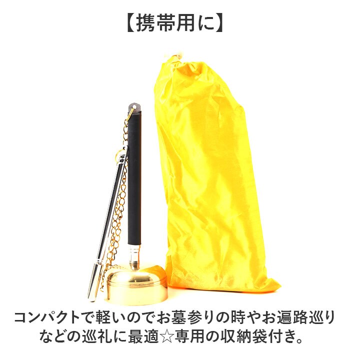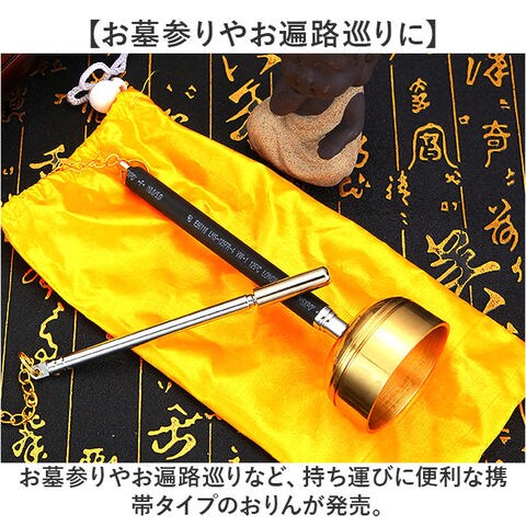 | 商品説明 | 【お墓参りやお遍路巡りに】お墓参りやお遍路巡りなど、持ち運びに便利な携帯タイプのおりんが発売。【りん棒とおりんが一つに】りん棒はおりんの持ち手に繋がっており、落下や紛失しない作り。【携帯用に】コンパクトで軽いのでお墓参りの時やお遍路巡りなどの巡礼に最適☆専用の収納袋付き。【透き通る音が特徴的】叩くと参拝者も心休まるような高く透き通る音色が鳴り響く。【持ち手の長さ調節が可能】おりんとりん棒の持ち手は伸縮ができ、使いやすい長さにできる◎【簡易祭壇や仏壇用に】コンパクトなサイズなので簡易的な祭壇や仏壇用にもオススメ♪ |