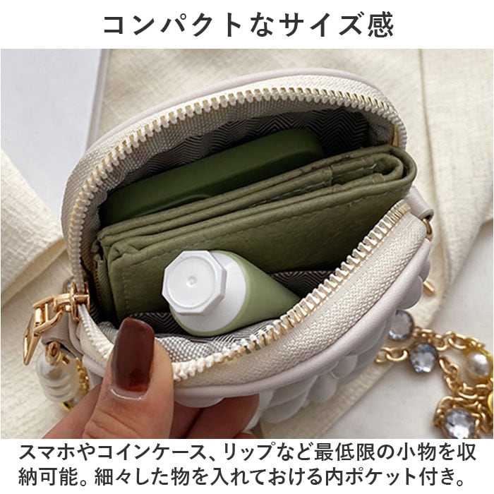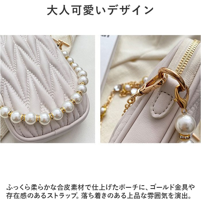 | 商品説明 | これ1つで身軽にお出かけ♪ミニマル派にうれしい「スマホポーチ」が新登場。【大人可愛いデザイン】ふっくら柔らかな合皮素材で仕上げたポーチに、ゴールド金具や存在感のあるストラップ。落ち着きのある上品な雰囲気を演出。【ラウンドファスナー開口】開口部はラウンド型にオープン。中身を確認しやすく、出し入れもラクラク。【コンパクトなサイズ感】スマホやコインケース、リップなど最低限の小物を収納可能。細々した物を入れておける内ポケット付き。【持ち方をアレンジ】キラッと輝くショルダーストラップを取り付けて、肩掛けや斜め掛けも自在。取り外してバッグインしてもOK♪【アクセントをプラス】イミテーションパールのチャームを取り付けて、可愛さアップ!【選べるカラー】ベーシックやコーデのアクセントになるカラーをラインナップ。お気に入りをチョイスして、外出のお供に☆【ポケット仕様】内側:オープンポケット×1 |