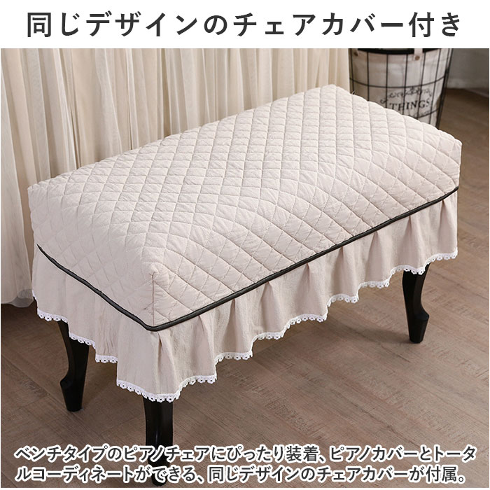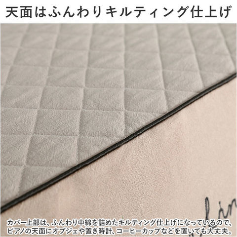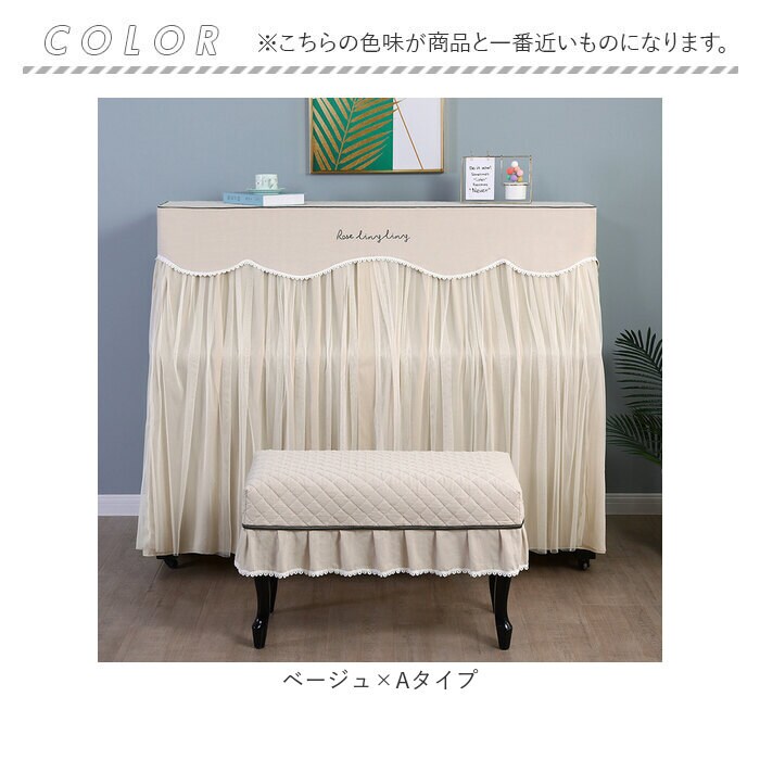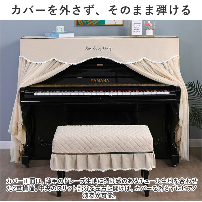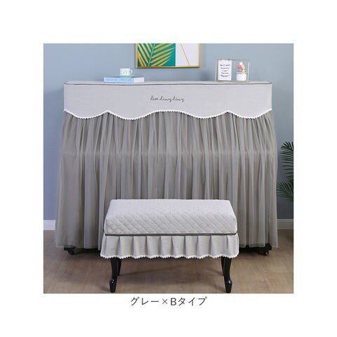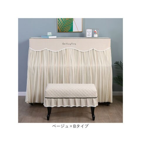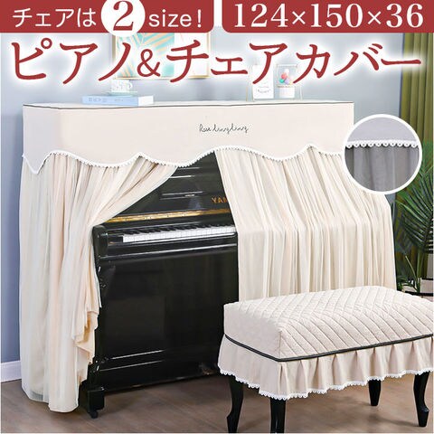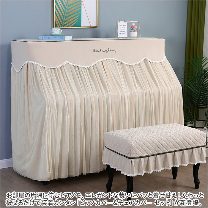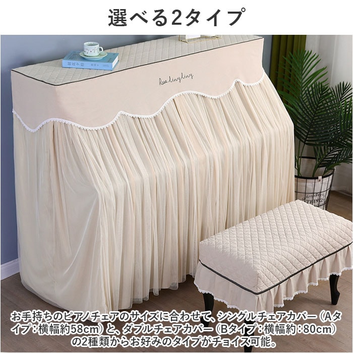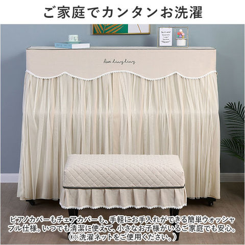 | 商品説明 | お部屋の片隅に佇むピアノを、エレガントな装いにパッと着せ替え!ふわっと被せるだけで装着カンタン「ピアノカバー&チェアカバー セット」が新登場。【ピアノ周りを明るくアップデート】艶やかな黒いパネルをキラリと光らせ、リビングや子ども部屋に鎮座するアップライトピアノ。重厚になりがちな雰囲気を華やかにアップデートするピアノカバー。【ホコリやキズからピアノを保護】鏡面のようなピアノのパネル表面に、柔らかな生地感のカバーをすっぽり足元まで被せることで、降り積もる小さなホコリや傷付きからピアノを優しく保護。【カバーを外さず、そのまま弾ける】カバー正面は、薄手のドレープ生地に透け感のあるチュール生地を合わせた2重構造。中央のスリット部分を左右に開けば、カバーを外さずにピアノ演奏が可能。【天面はふんわりキルティング仕上げ】カバー上部は、ふんわり中綿を詰めたキルティング仕上げになっているので、ピアノの天面にオブジェや置き時計、コーヒーカップなどを置いても大丈夫。【同じデザインのチェアカバー付き】ベンチタイプのピアノチェアにぴったり装着、ピアノカバーとトータルコーディネートができる、同じデザインのチェアカバーが付属。【選べる2タイプ】お手持ちのピアノチェアのサイズに合わせて、シングルチェアカバー(Aタイプ:横幅約58cm)と、ダブルチェアカバー(Bタイプ:横幅約:80cm)の2種類からお好みのタイプがチョイス可能。【ご家庭でカンタンお洗濯】ピアノカバーもチェアカバーも、手軽にお手入れができる簡単ウォッシャブル仕様。いつでも清潔に使えて、小さなお子様がいるご家庭でも安心。(※洗濯ネットをご使用ください。)【お部屋に馴染むシックなカラー】お部屋の雰囲気にすっきり調和する、柔らかく落ち着いた雰囲気のカラーバリエーション。カバー上部を優雅に縁取る白いレースが可憐な雰囲気。 |