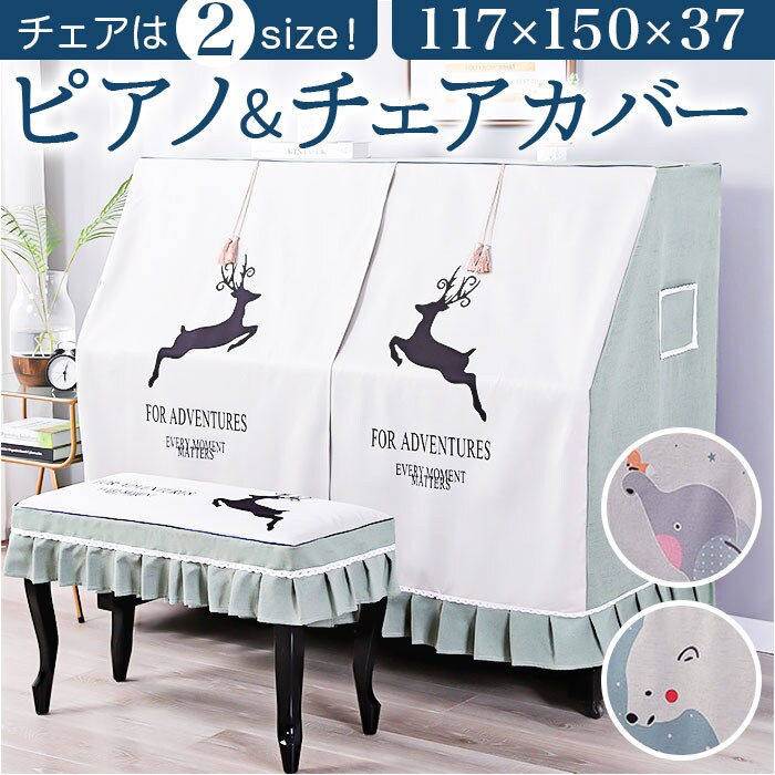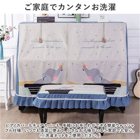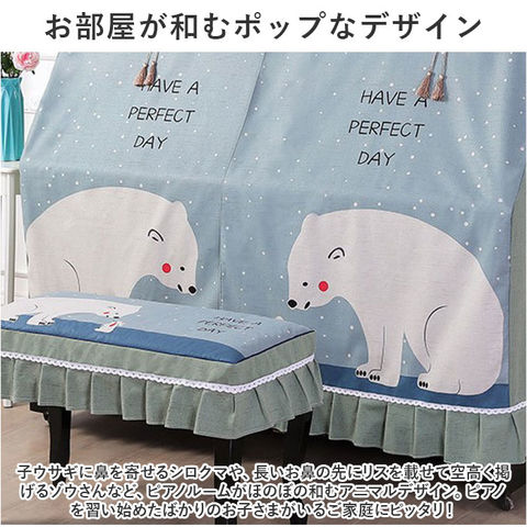 | 商品説明 | 子ども部屋の片隅に佇むピアノを、ポップな雰囲気にアップデート!ふわっと被せるだけで装着カンタン「ピアノカバー&チェアカバー セット」が新登場。【ピアノ周りを明るくアップデート】艶やかな黒いパネルをキラリと光らせ、リビングや子ども部屋に鎮座するアップライトピアノ。重厚になりがちな雰囲気を可愛いらしく着せ替えて、ピアノの練習時間をもっと楽しく!【ホコリやキズからピアノを保護】鏡面のようなピアノのパネル表面に、柔らかな生地感のカバーをすっぽり足元まで被せることで、降り積もる小さなホコリや傷付きからピアノを優しく保護。【カバーを外さず、そのまま弾ける】サラッと肌触りのよい杢調ポリエステル生地いっぱいに、心がほっこり温まるアニマルイラストをプリント!中央のスリット部分を左右に開けば、カバーを外さずにピアノ演奏が可能。【小物用ミニポケット付き】ピアノカバーの両側面には、スマホや手帳など、ちょっとした小物をちょこんとしまえる、フリルで縁取られたミニポケット付き。【同じデザインのチェアカバー付き】ベンチタイプのピアノチェアにぴったり装着、ピアノカバーとトータルコーディネートができる、同じデザインのチェアカバーが付属。【選べる2タイプ】お手持ちのピアノチェアのサイズに合わせて、シングルチェアカバー(Aタイプ:横幅約58cm)と、ダブルチェアカバー(Bタイプ:横幅約:76cm)の2種類からお好みのタイプがチョイス可能。【ご家庭でカンタンお洗濯】ピアノカバーもチェアカバーも、手軽にお手入れができる簡単ウォッシャブル仕様。いつでも清潔に使えて、小さなお子様がいるご家庭でも安心。(※洗濯ネットをご使用ください。)【お部屋が和むポップなデザイン】子ウサギに鼻を寄せるシロクマや、長いお鼻の先にリスを載せて空高く掲げるゾウさんなど、ピアノルームがほのぼの和むアニマルデザイン。ピアノを習い始めたばかりのお子さまがいるご家庭にピッタリ! |